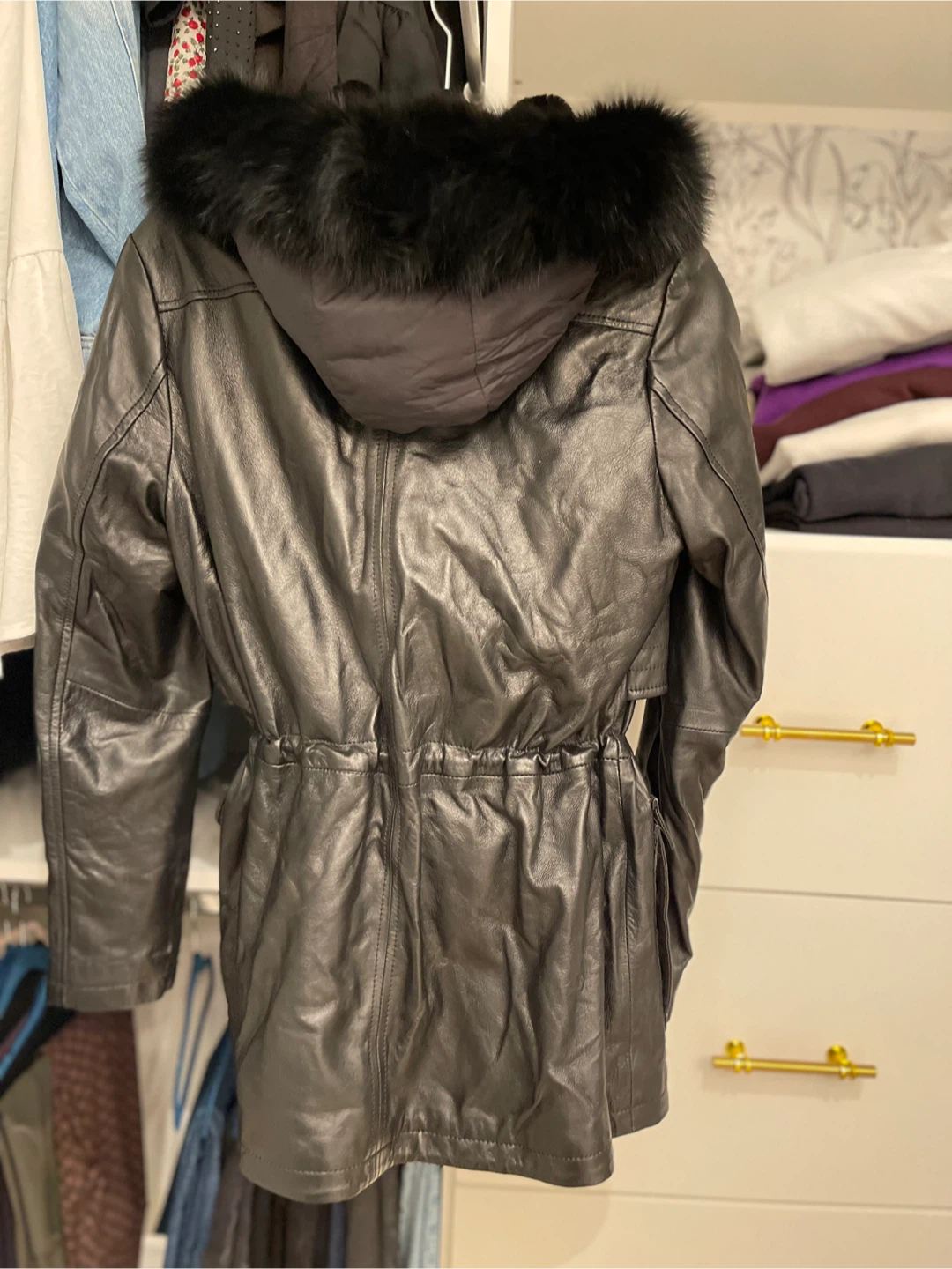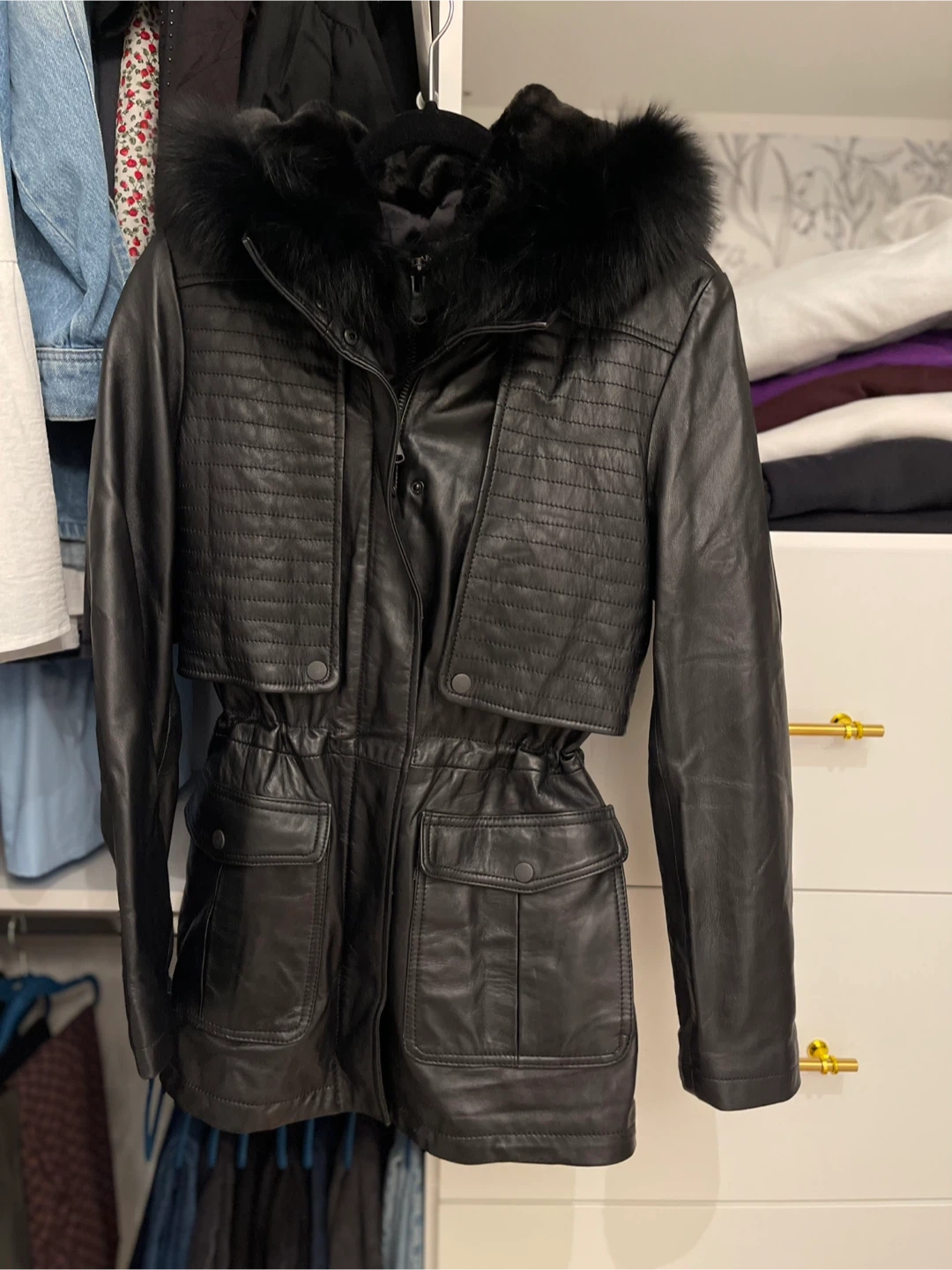 I'm selling a Danier leather jacket in size XS. It's a stylish black jacket with a fur hood, perfect for staying warm and fashionable during the colder months