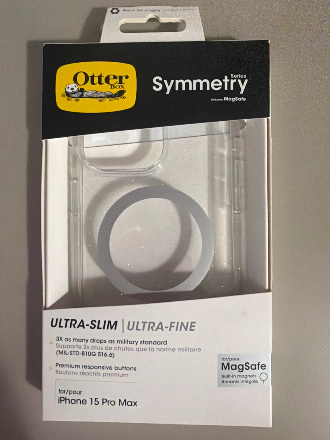 Selling a clear Otterbox Symmetry Series case for the iPhone 15 Pro Max! It's ultra-slim and ultra-fine, offering great protection without adding bulk. It's made with more than 50% recycled plastic and features built-in magnets for MagSafe chargers and accessories. The box is included!