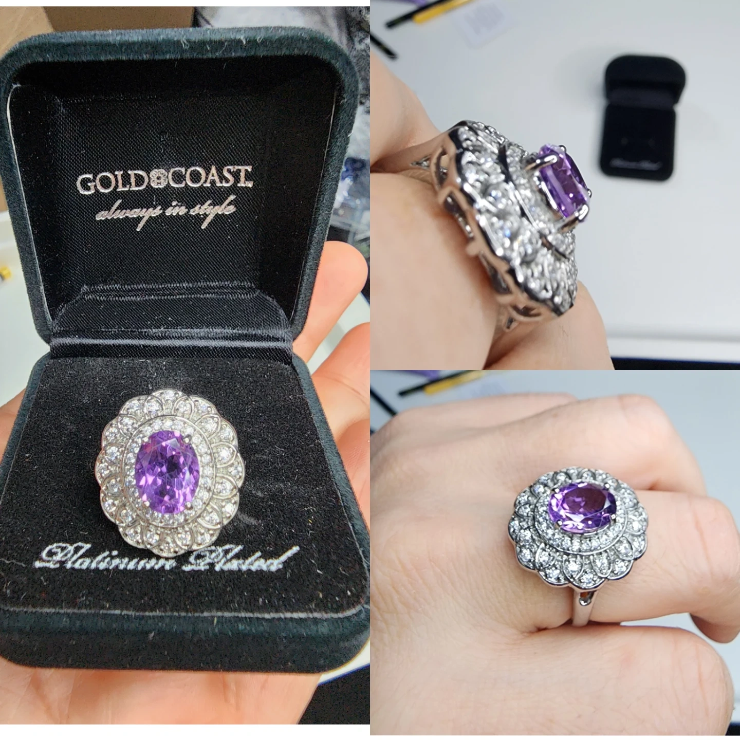 Here's a beautiful Gold Coast ring! It's platinum plated and features a lovely purple stone surrounded by smaller stones. Comes in its original box, perfect for gifting or safekeeping