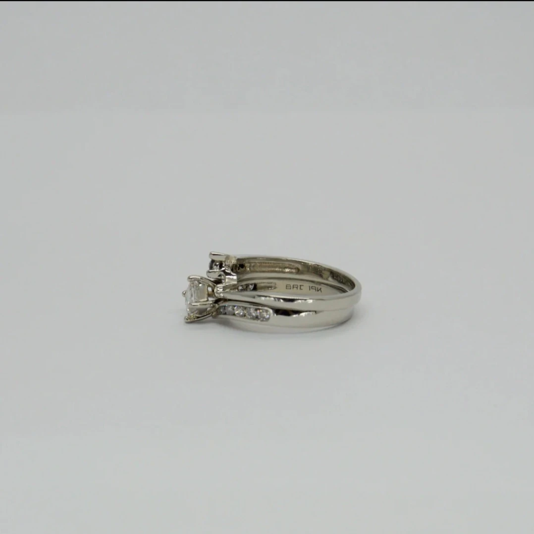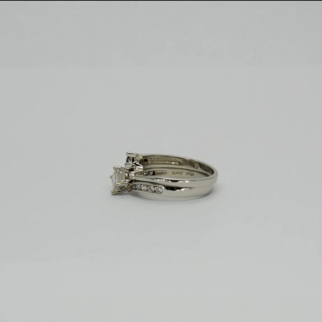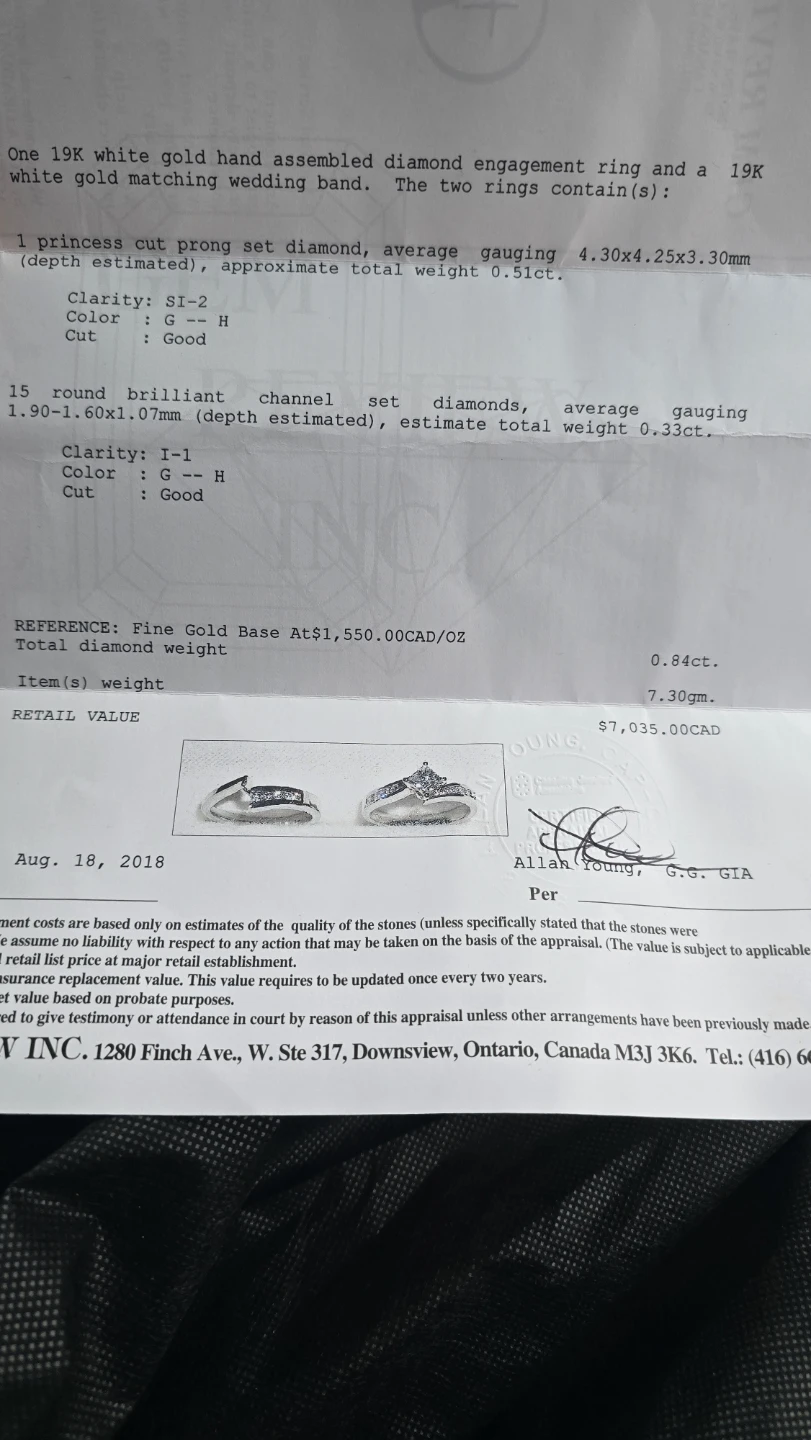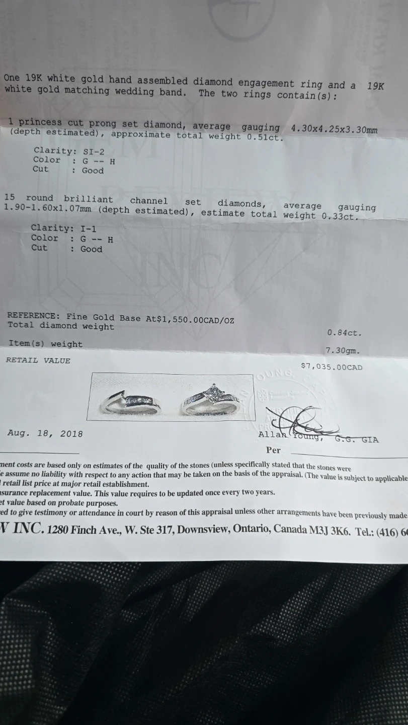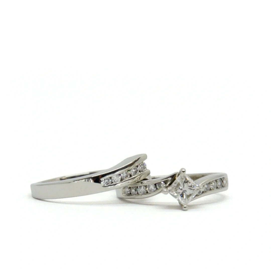 Selling a beautiful 7.3g 19K white gold hand assembled diamond engagement ring and matching wedding band. The set contains a princess cut prong set diamond, with approximate total weight of 0.51ct. It also features 15 round brilliant channel set diamonds, with an estimated total weight of 0.33ct. Originally valued at $7035 CAD
