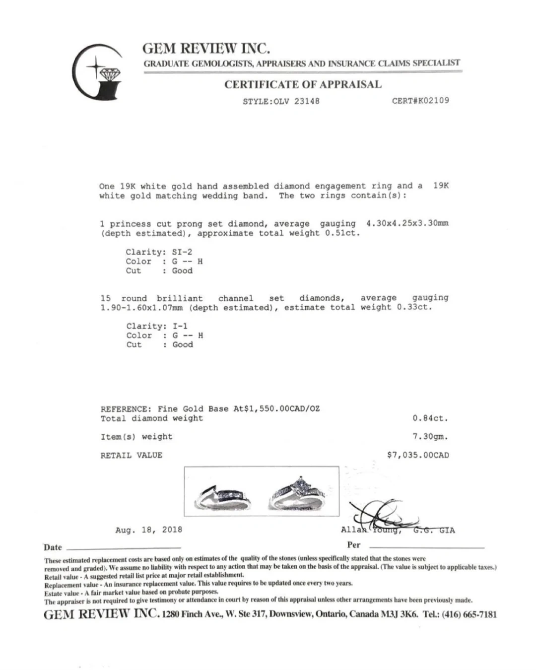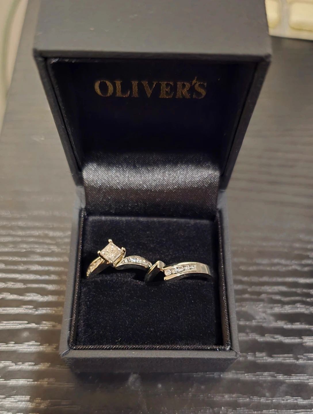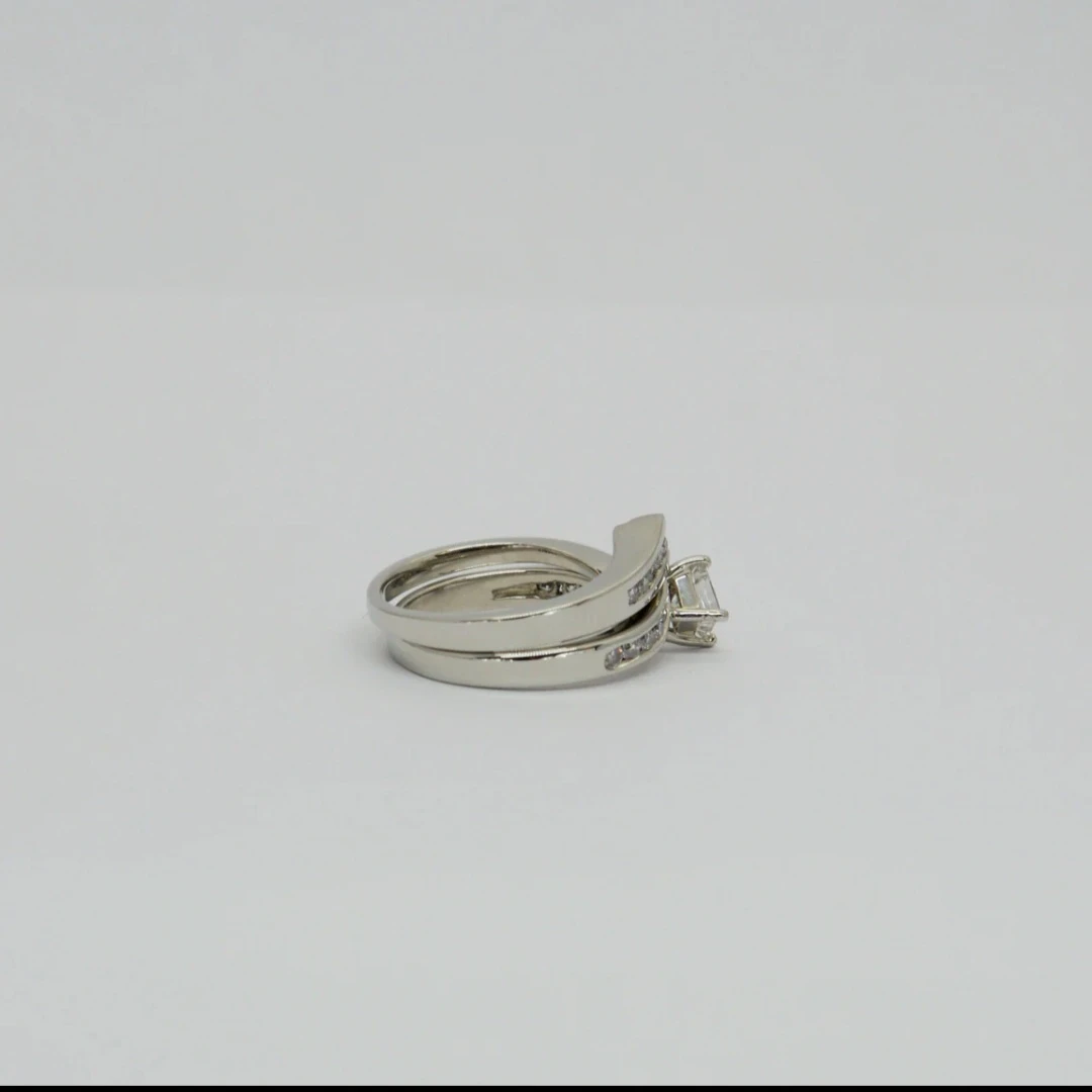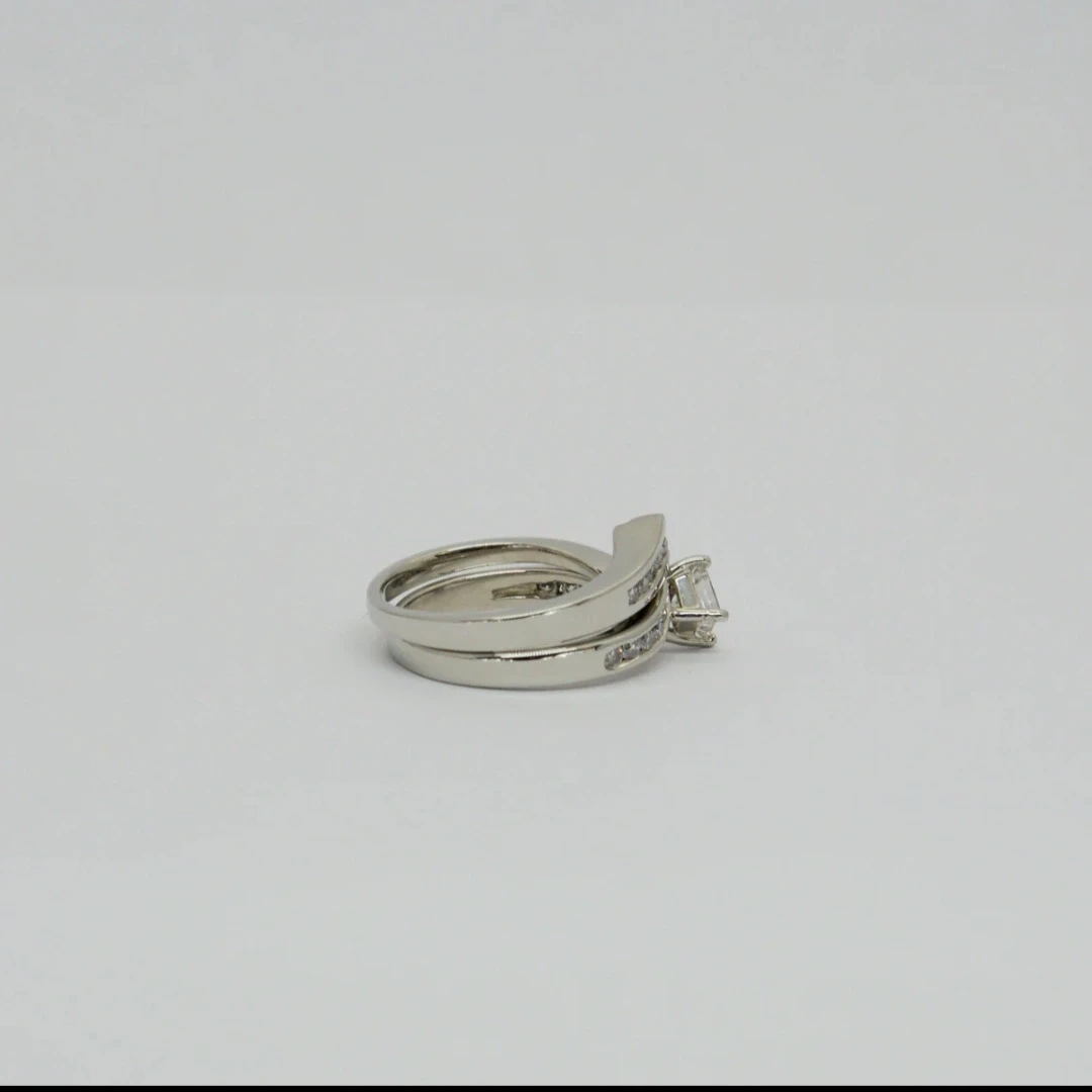 Selling a beautiful 7.3g 19K white gold hand assembled diamond engagement ring and matching wedding band. The set contains a princess cut prong set diamond, with approximate total weight of 0.51ct. It also features 15 round brilliant channel set diamonds, with an estimated total weight of 0.33ct. Originally valued at $7035 CAD