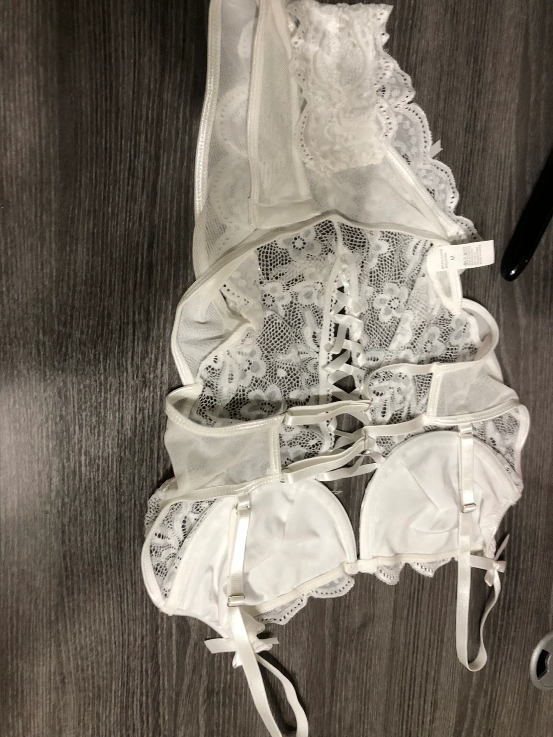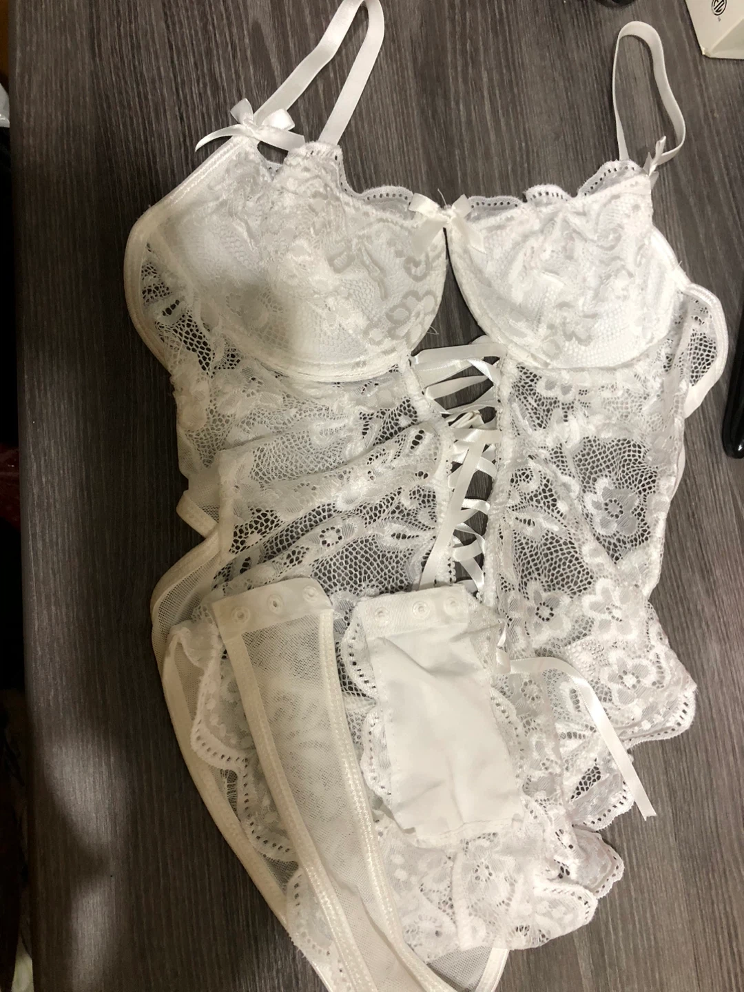 Selling a new beautiful white lace lingerie in size medium. It features delicate lace detailing and a corset-style design. Perfect for adding a touch of elegance to your wardrobe!