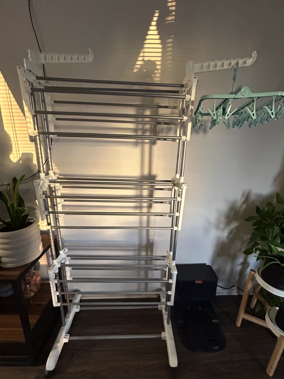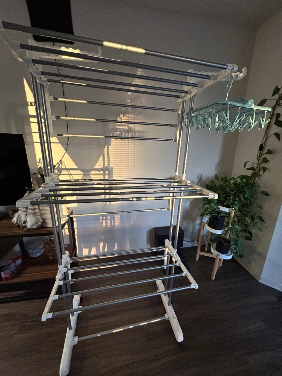 I'm selling a foldable clothes drying rack. It's in great condition and ready to use! This rack is perfect for apartments or homes with limited space. It folds up easily for storage when not in use.