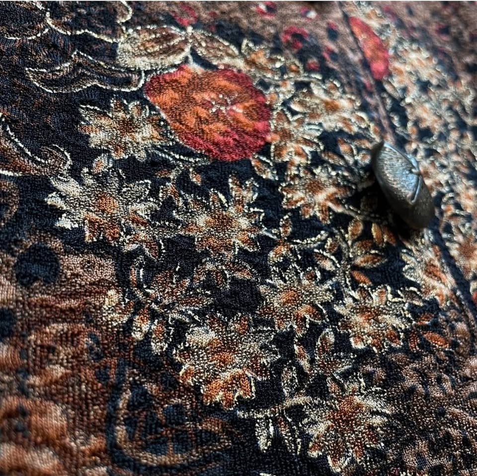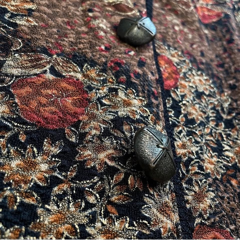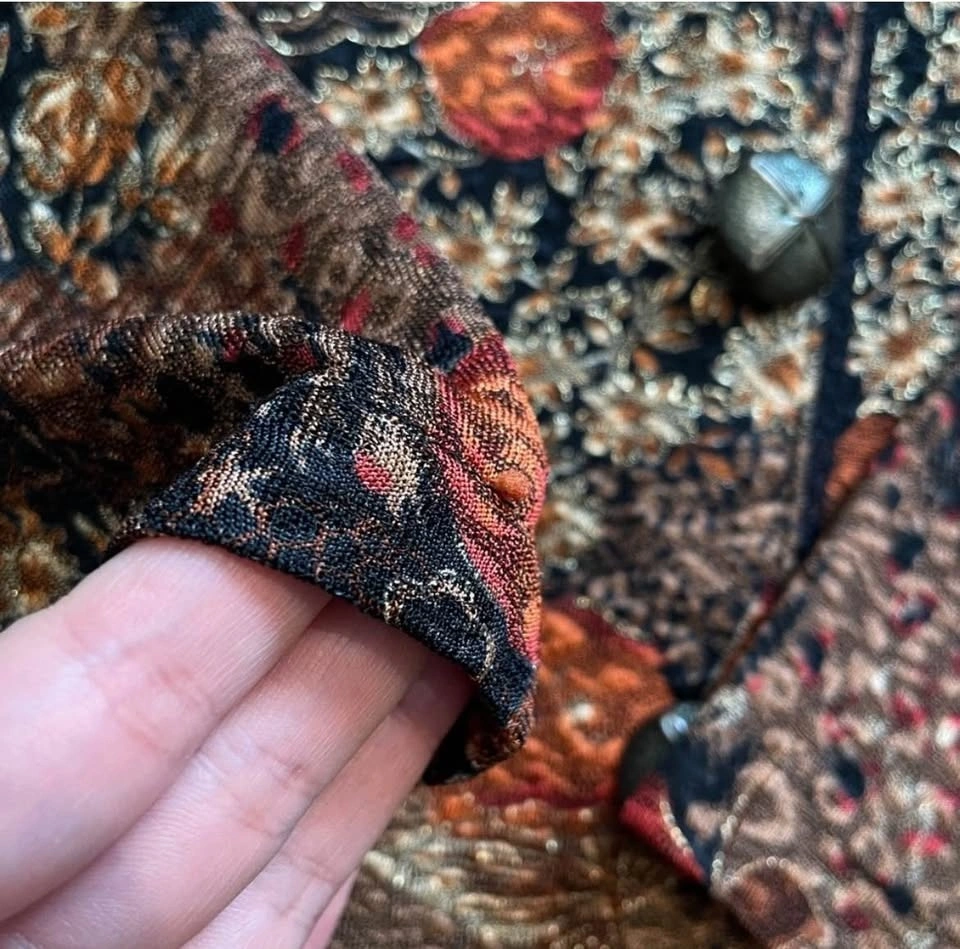 Gorgeous 1980s–90s lightweight tapestry jacket in a rich autumn floral pattern of rust orange, gold, cream, and black.