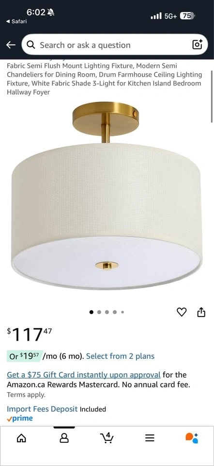 BNIB Fabric Semi Flush Mount Lighting Fixture, Modern Semi Chandeliers, White Fabric Shade 3-Light (Gold finish)