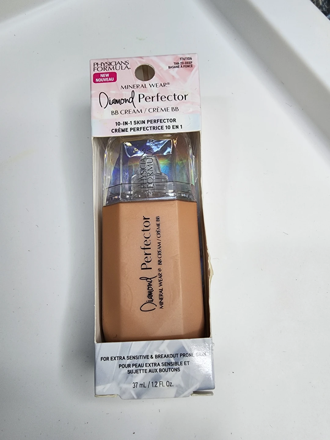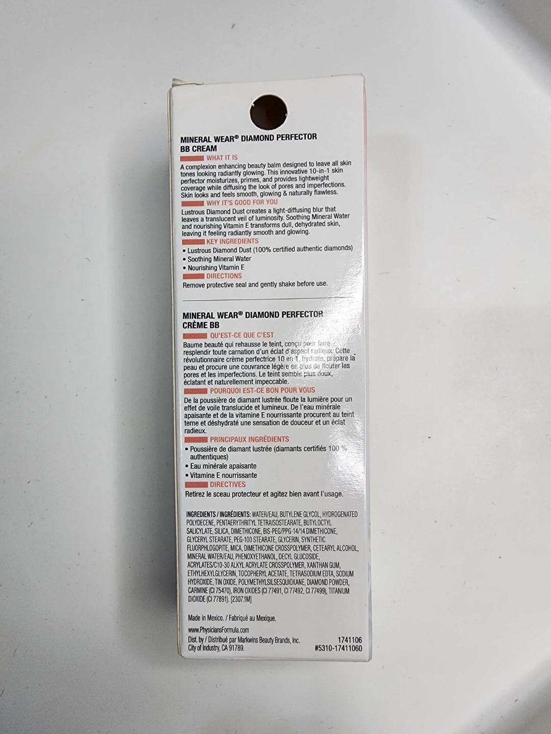 This is a brand new Physicians Formula Mineral Wear Diamond Perfector BB Cream! It's a 10-in-1 skin perfector that moisturizes, primes, conceals, and brightens. It also evens skin tone and minimizes pores. The BB cream contains lustrous diamond dust and nourishing Vitamin E. It's for extra sensitive and breakout prone skin. Size is 37 ml / 1.2 Fl oz