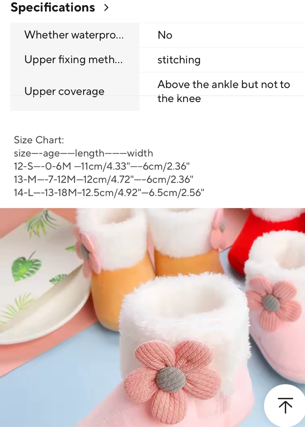 These adorable baby booties are perfect for keeping your little one's feet warm and cozy! They feature a cute flower detail and are size 13-18 mths The upper coverage is above the ankle but not to the knee, and the upper fixing method is stitching