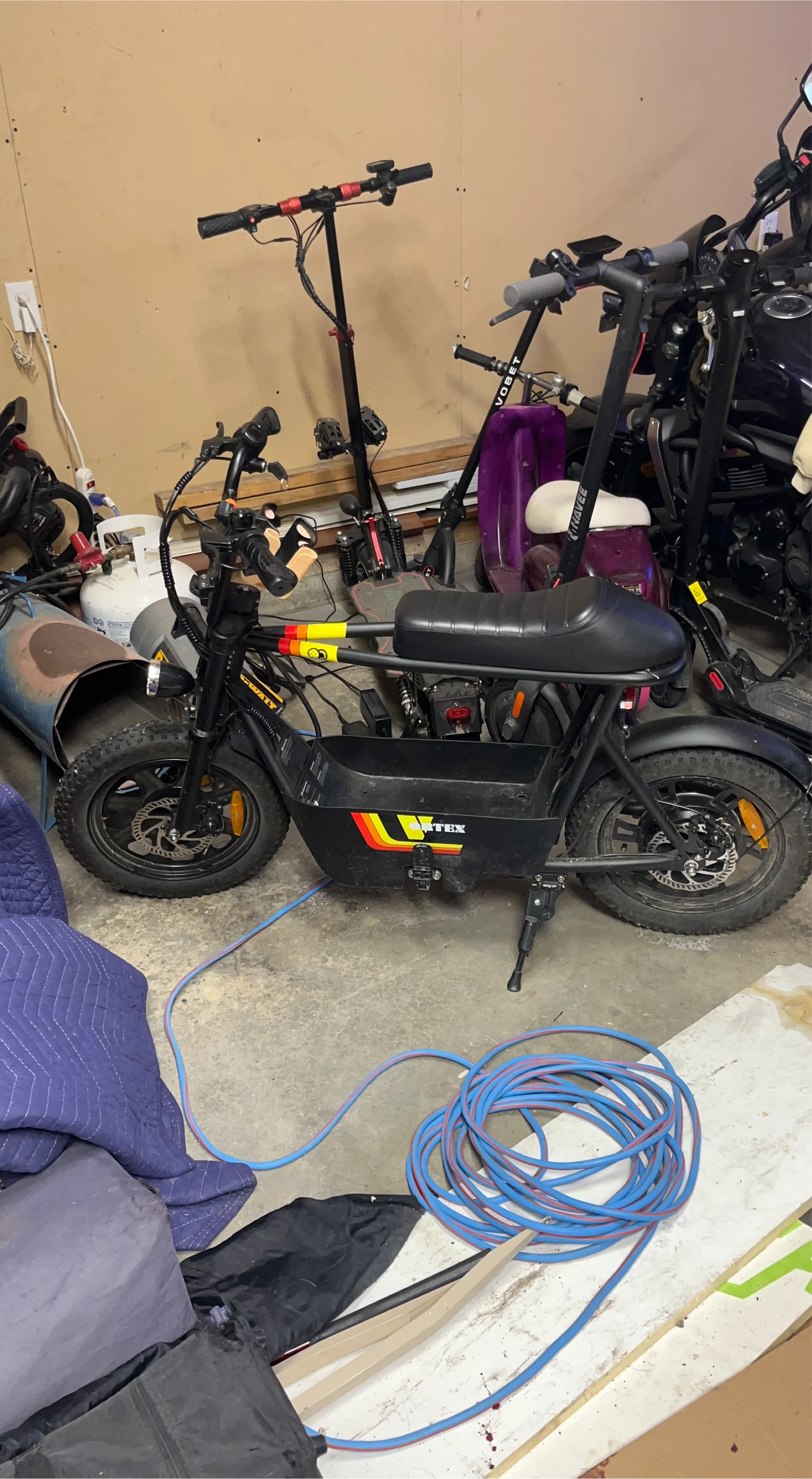 Selling a vintage Vortex electric mini bike. It has a black frame with yellow and red stripes. Perfect for cruising around the neighbourhood!