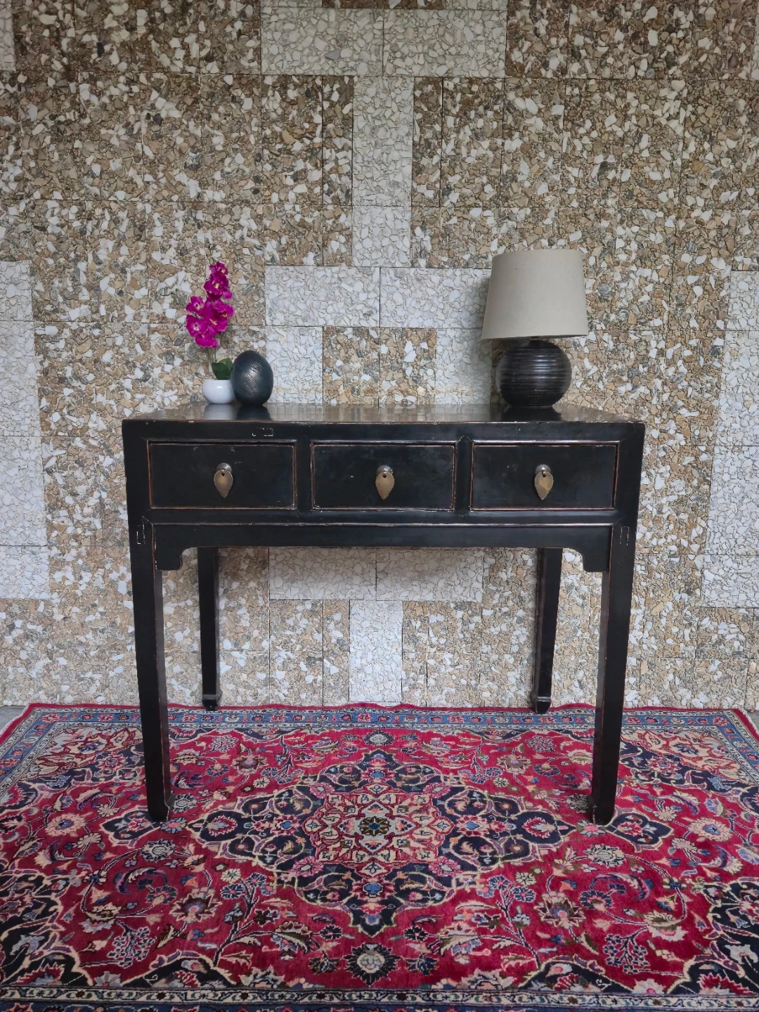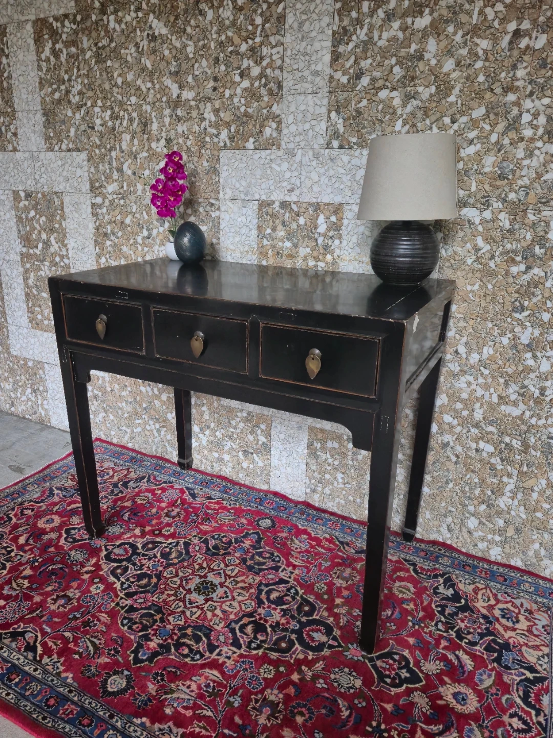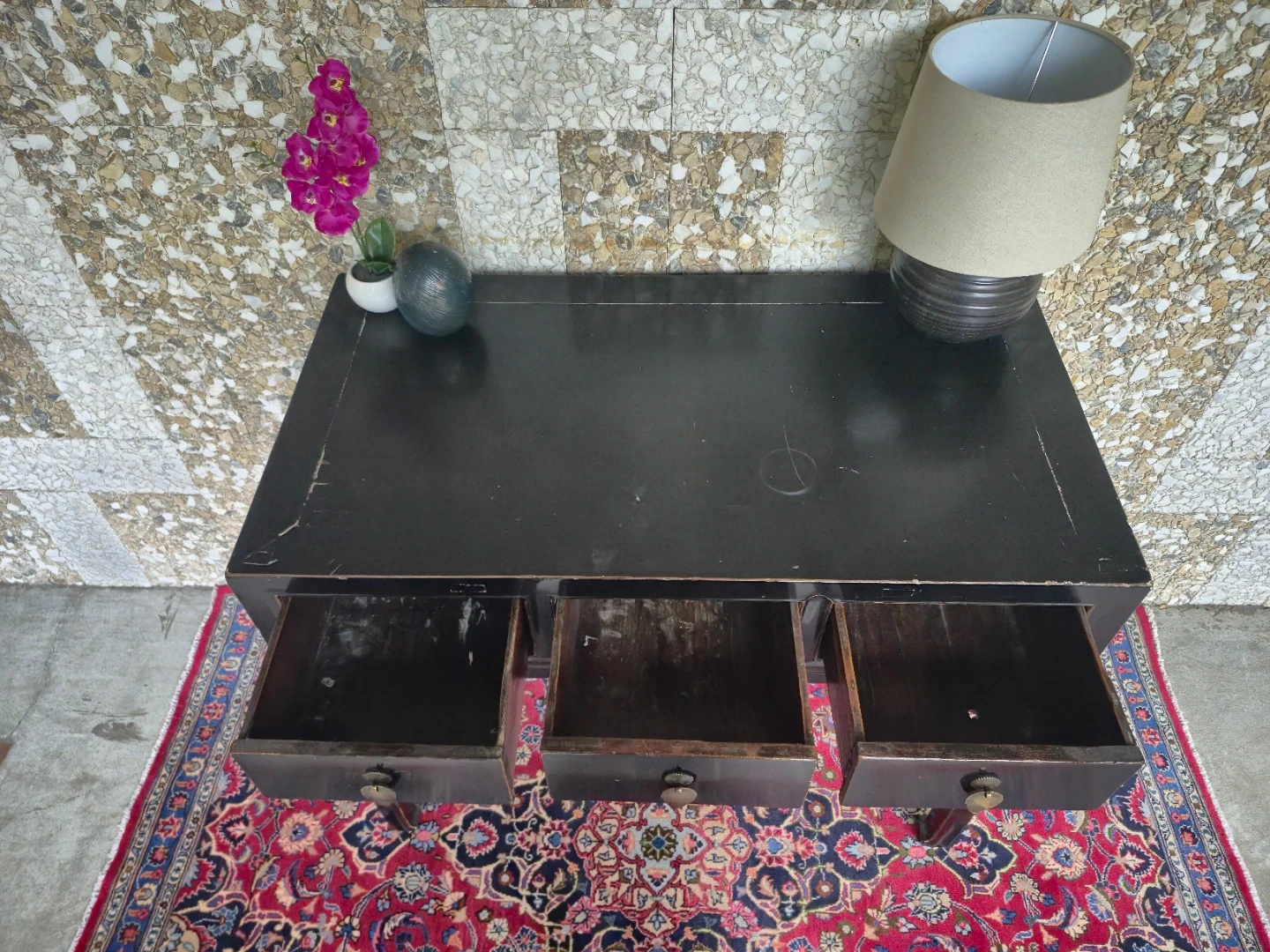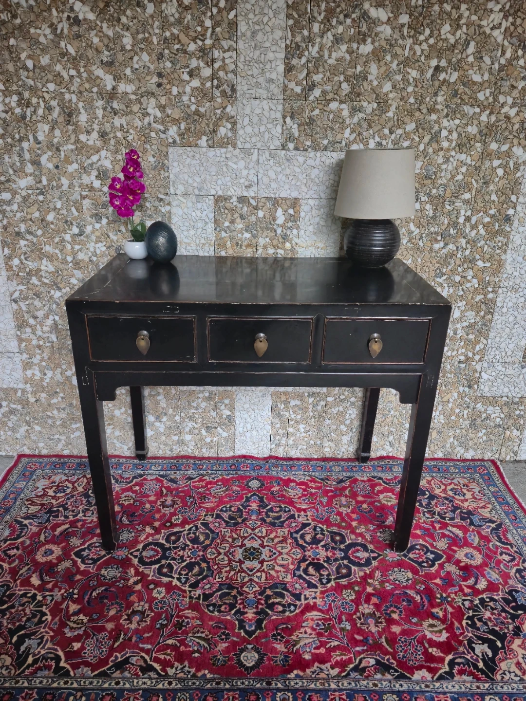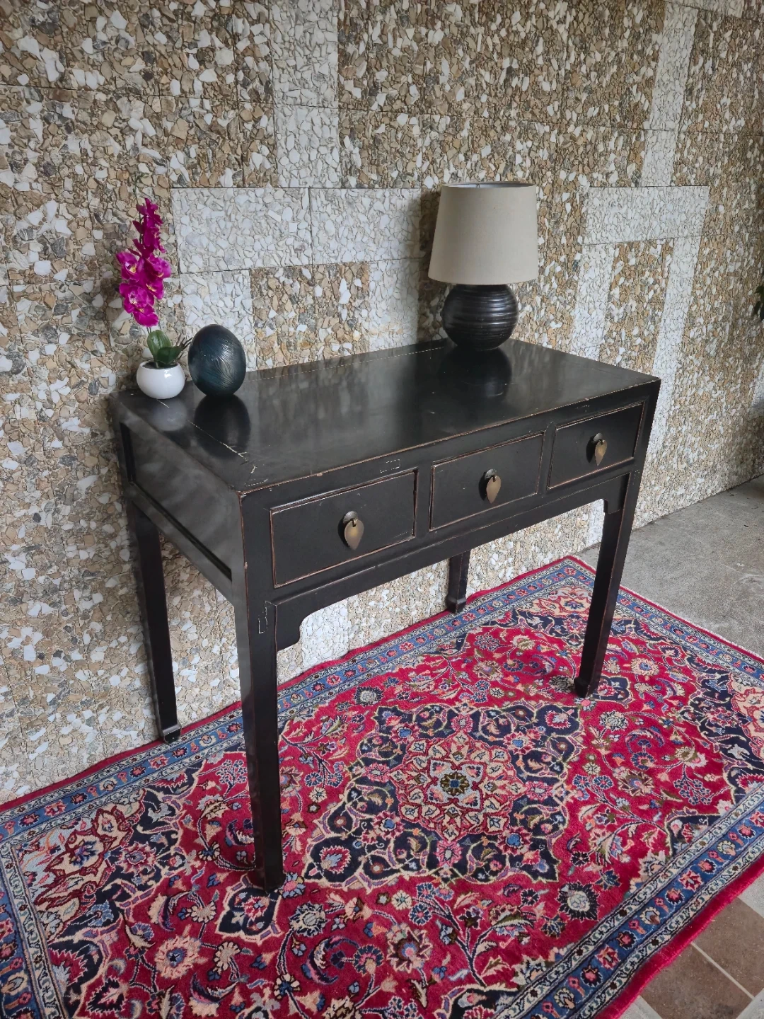 Selling a lovely black lacquer wooden console table! It features three drawers, perfect for storing small items. Some clear signs of wear on the top but overall good vintage condition.