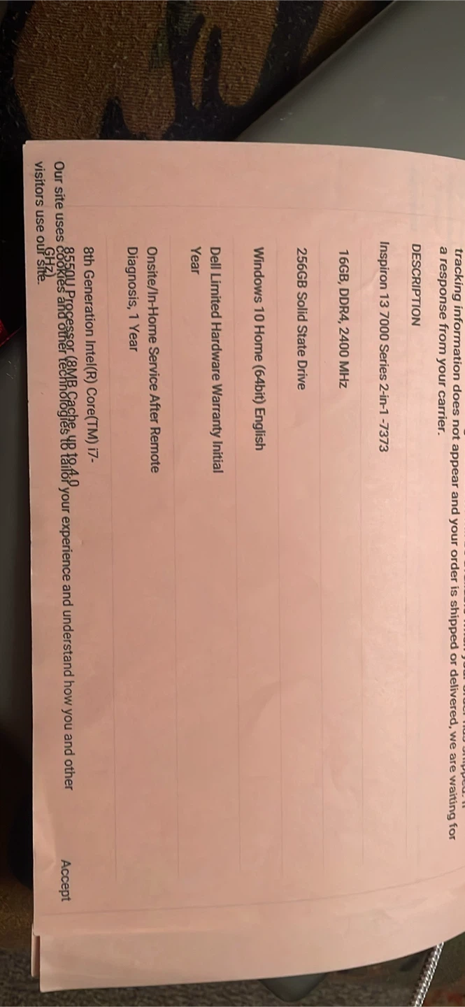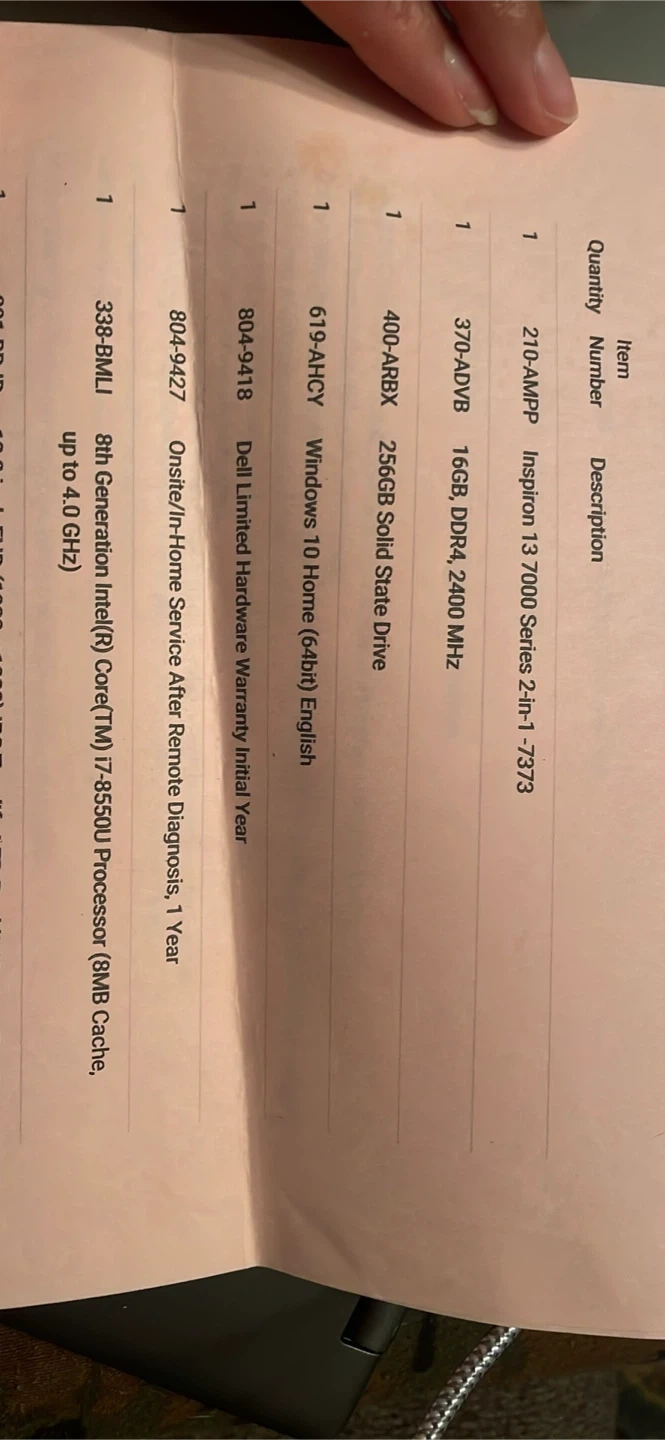 Selling a Dell Inspiron 13 7000 Series 2-in-1 7373 laptop. It features Windows 10 Home (64bit) English and has 16GB DDR4, 2400 MHz. It also has a 256GB Solid State Drive and an 8th Generation Intel(R) Core(TM) i7-8550U Processor.