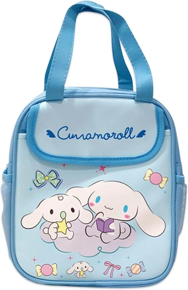 A brand new, never used Cinnamoroll insulated lunch bag. Measures 9.8 inches across, 5.9 inches deep, and 11 inches tall. Features 2 sturdy mesh side drink holders, a handy front storage pocket, handy carry straps for cloakrooms and closets, zippers to keep things out of sight. Versatile, leakproof, and it will keep you and your kids happy.