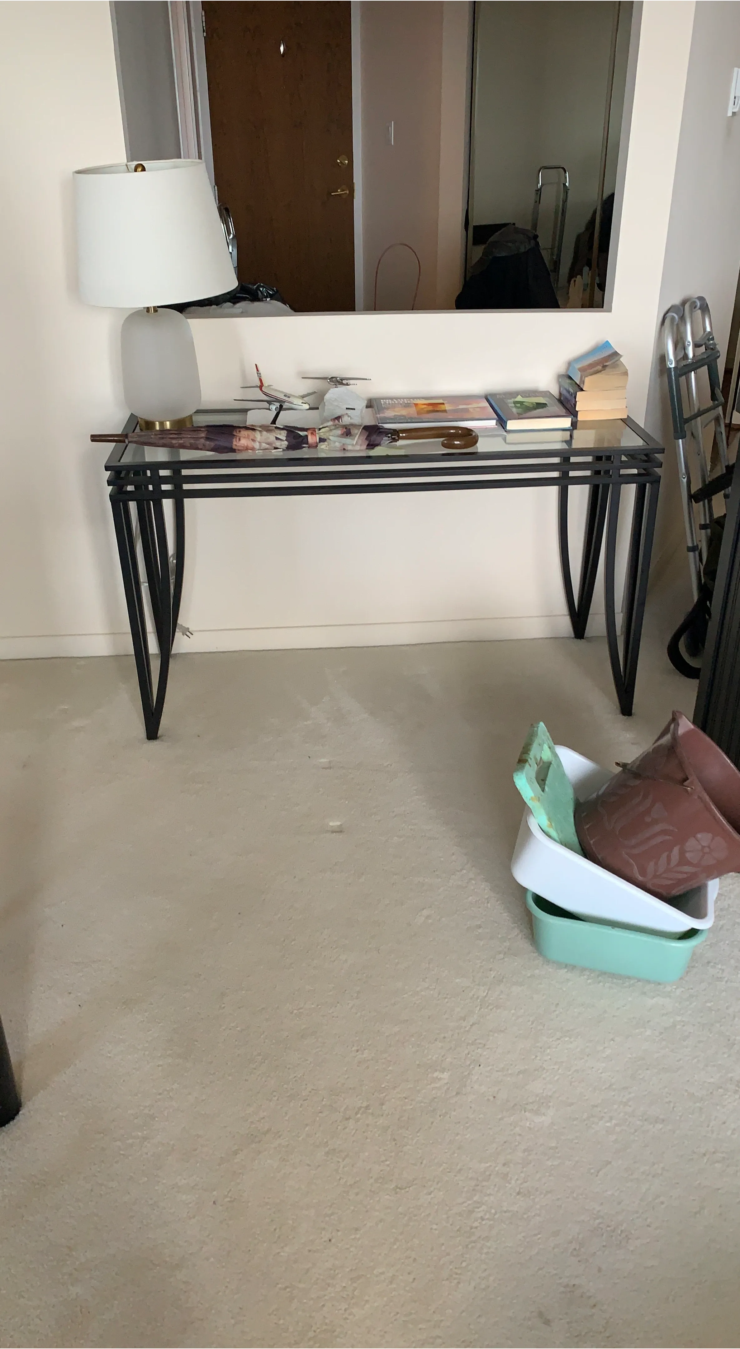 Here's a console table with a glass top and a black metal frame. It could be perfect for an entryway or living room. It has a simple, modern look!