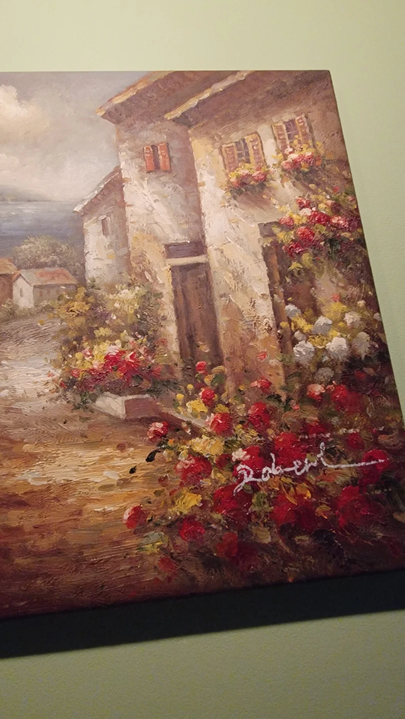 Selling a beautiful Roberts painting featuring an Italian village scene. This piece would add a touch of warmth and charm to any room. The skill by the artist and effects of the paint cannot be captured on my android phone.