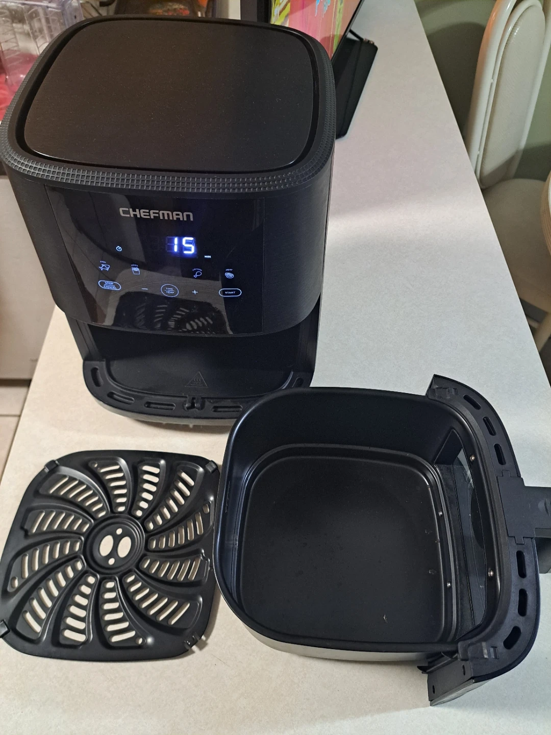 Selling a Chefman TurboFry Touch Easy-View Air Fryer! It's in great condition and comes with the user guide and the original box. This air fryer makes meals in minutes with less added fat, thanks to its shake notification that ensures even cooking. It's perfect for those who want delicious meals with convenient cooking!