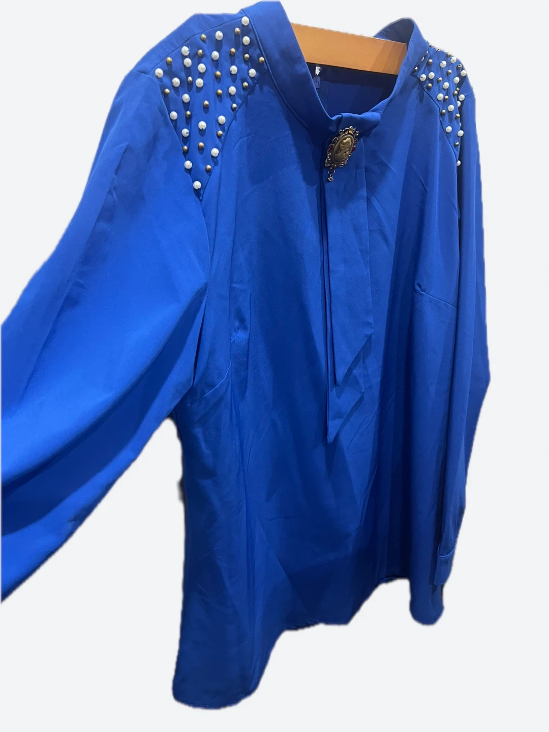 Selling a lovely blue blouse with pearl detailing on the shoulders. It has a unique tie front and a decorative brooch.