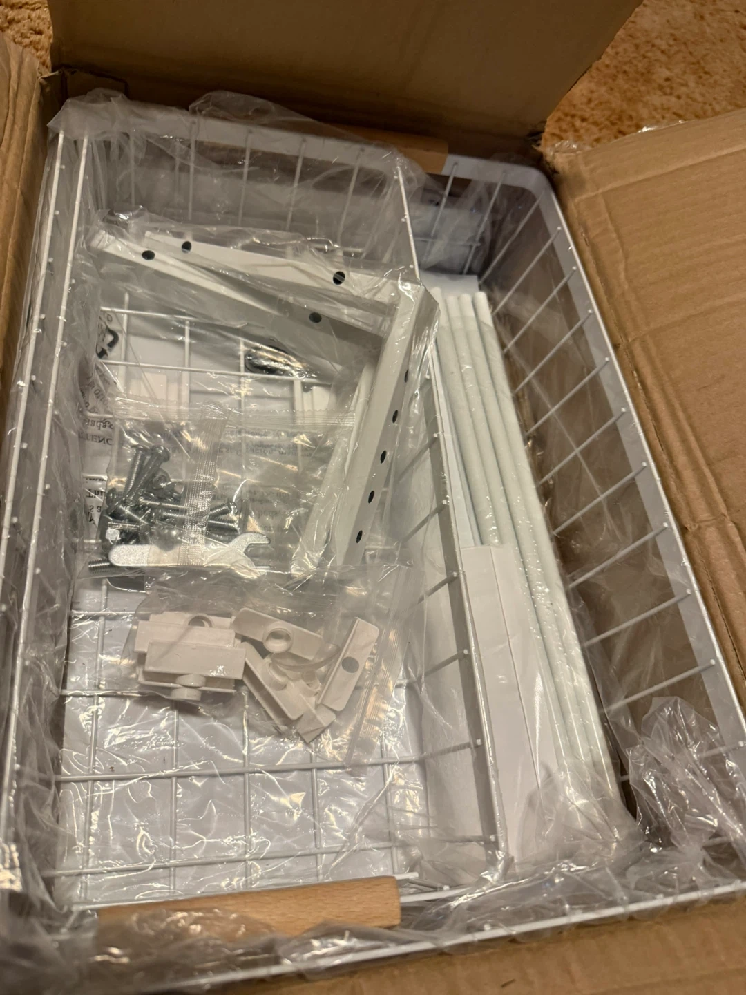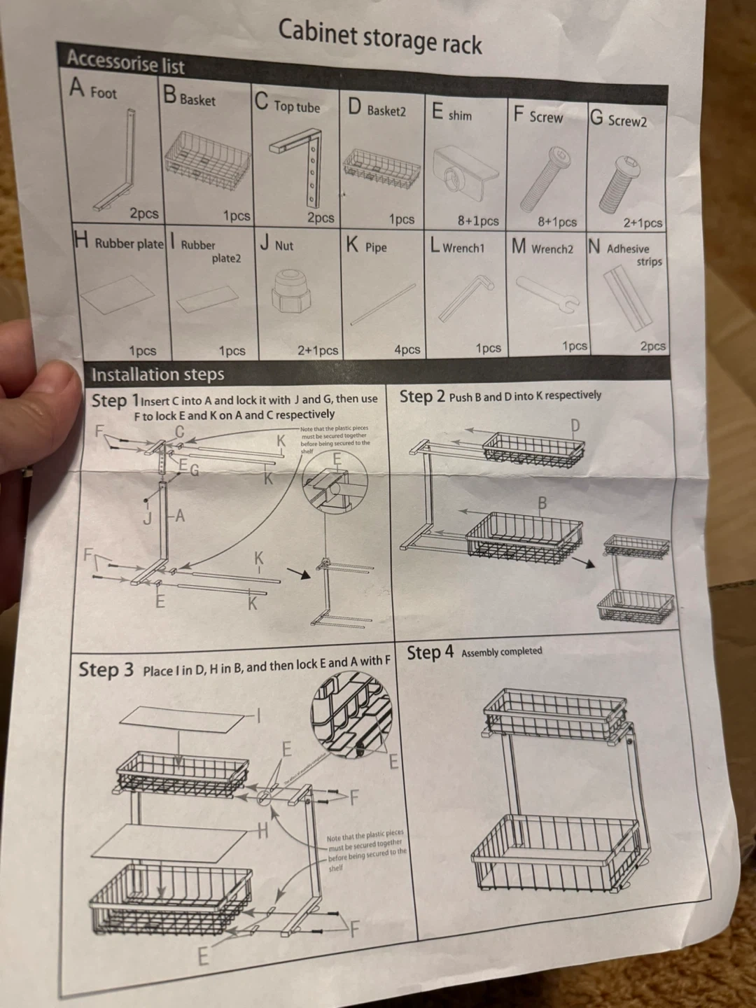 I'm selling a brand new, unassembled 2-tier cabinet storage rack! This rack is perfect for organizing your kitchen or bathroom.
