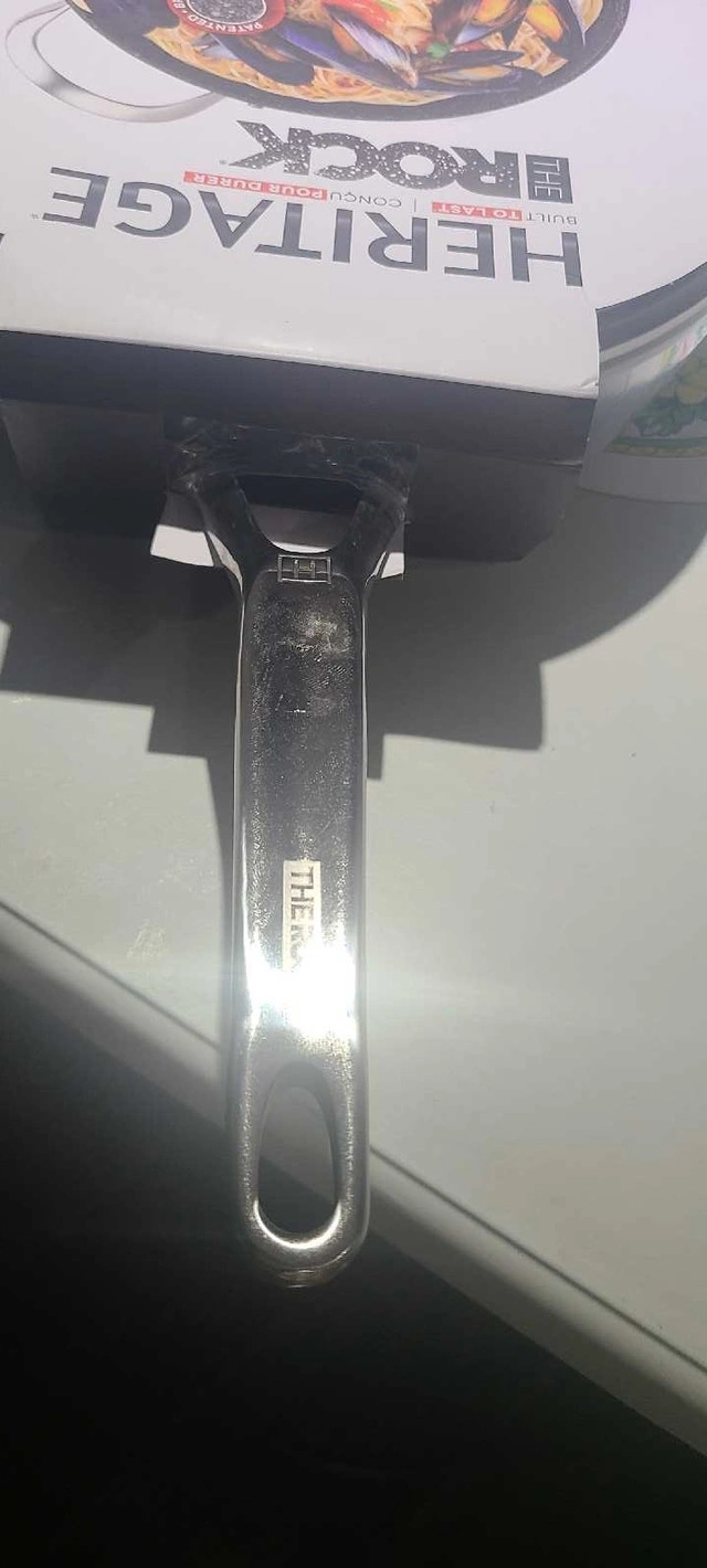 I'm selling a new The Rock Heritage 11-inch fry pan, designed for even heat distribution and superior non-stick performance. This durable pan is perfect for all your cooking needs. Specifications: * Brand: The Rock Heritage * Size: 11-inch * Material: High-gauge aluminum base * Features: Non-stick surface, oven-safe Ready to sizzle? If the ad's up, the pan's ready to go!