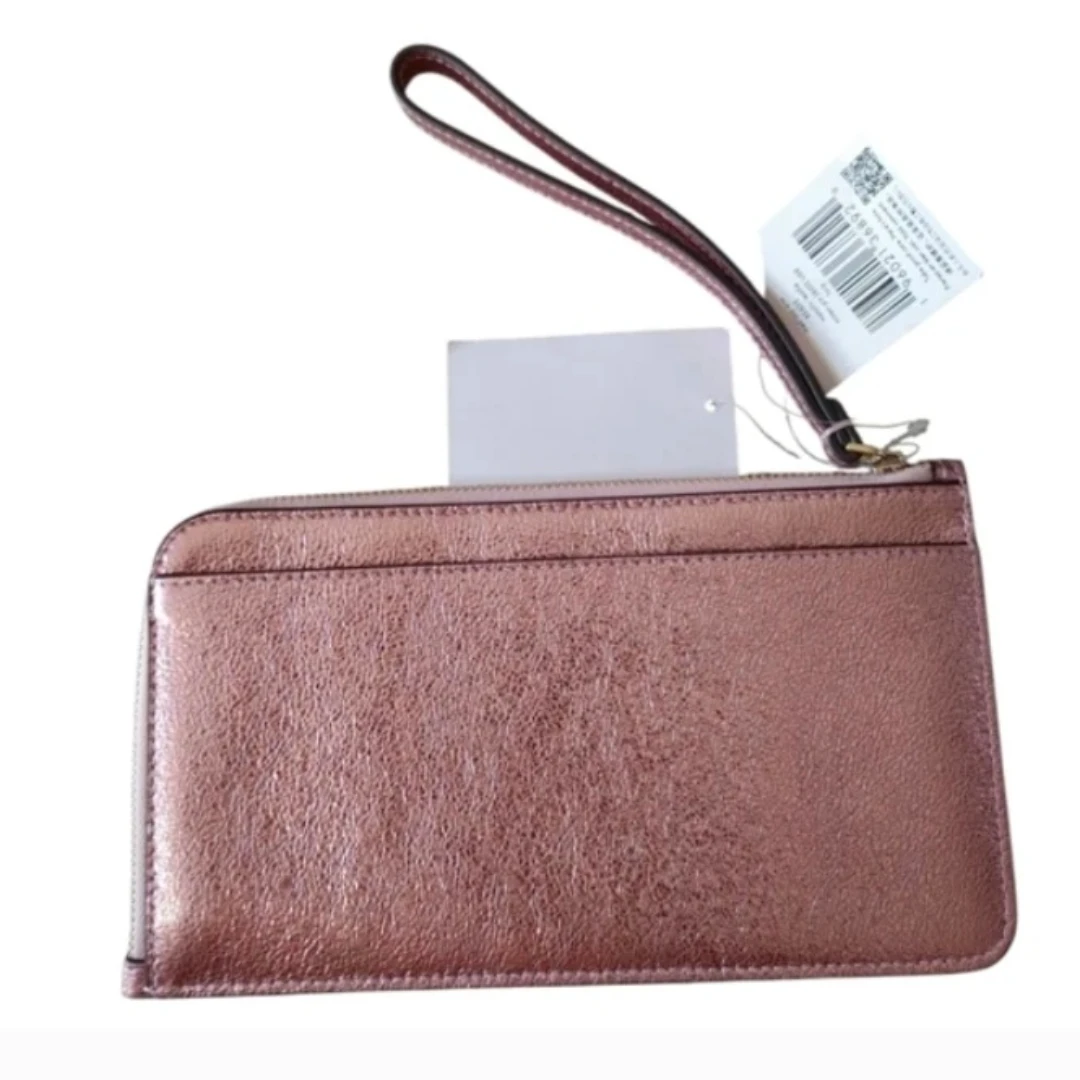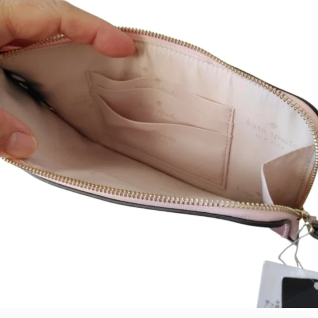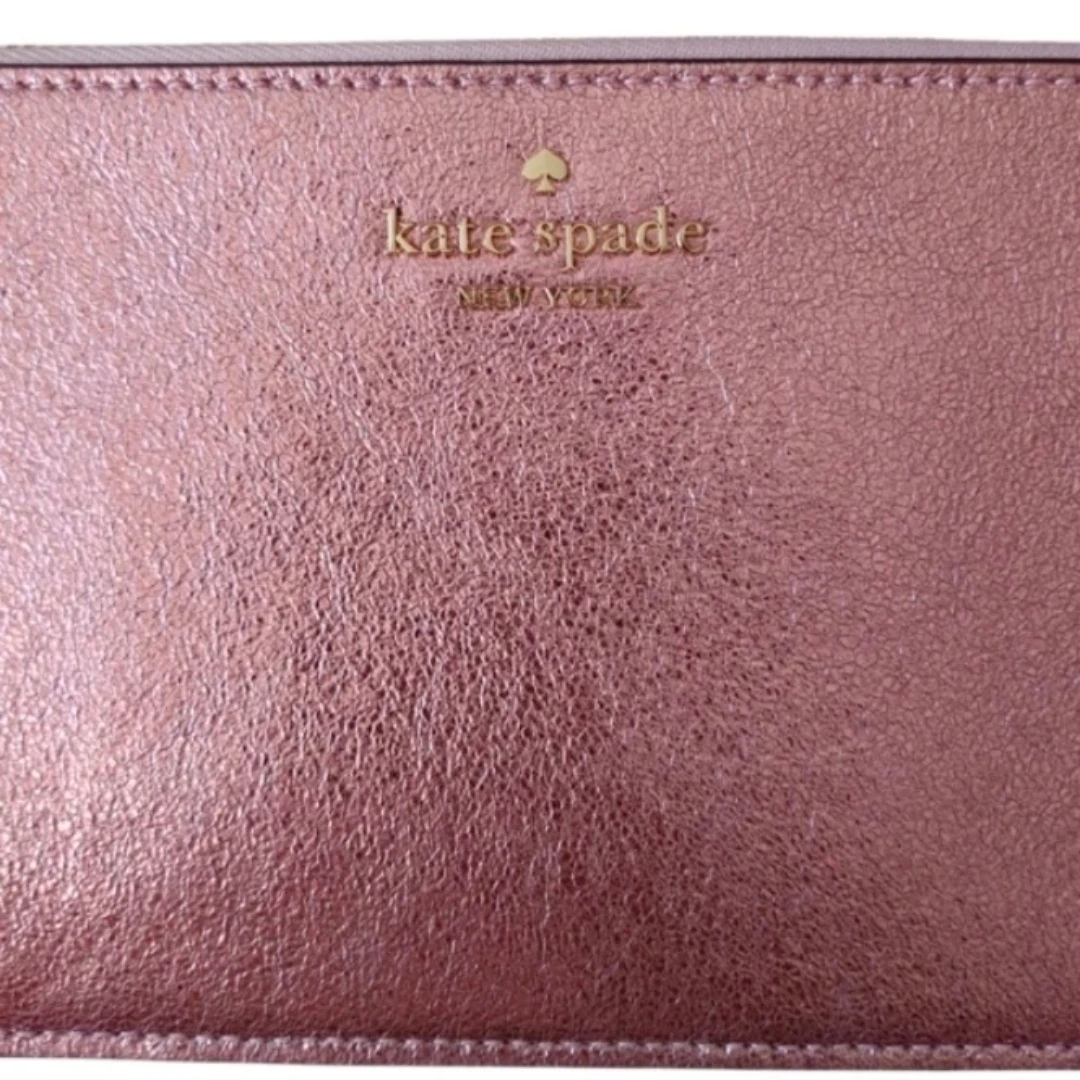 Features: Kate Spade pinmount logo. Zip closure. The interior has 4 credit card slots. Pebbled leather. Lining: Two Way Script Logo Lining.