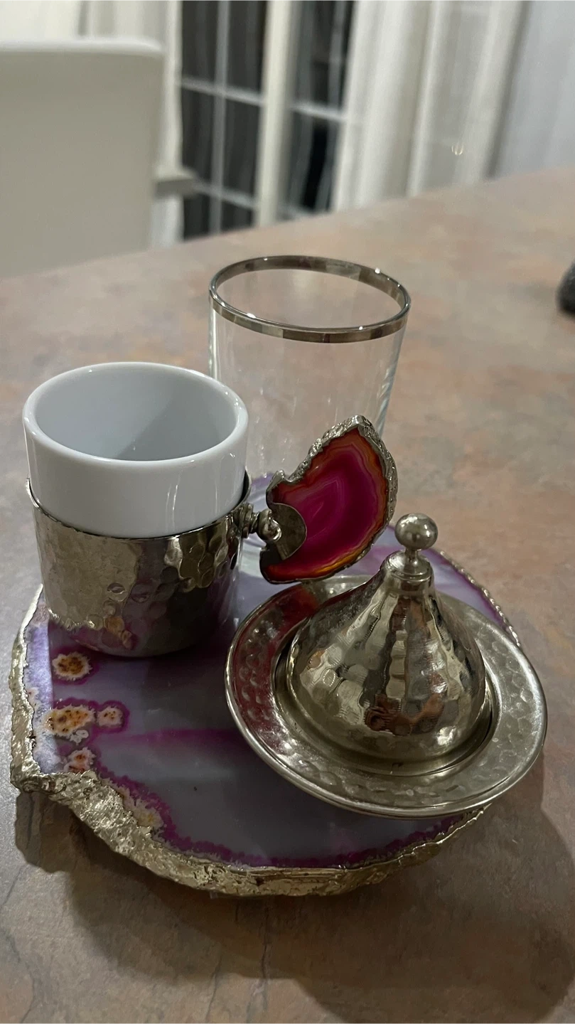 Selling a beautiful agate stone coaster set. Perfect for adding a touch of elegance to your home decor! The set includes a coaster, a cup, a glass and a lid.