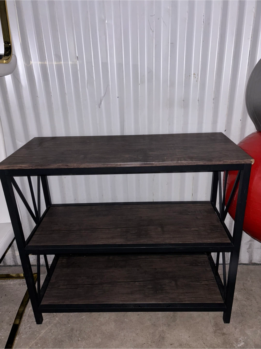 Selling a sturdy 3-tier shelf with a dark brown wood-look top and black metal frame. It's in great shape and ready to hold your books, plants, or anything else you need to display!