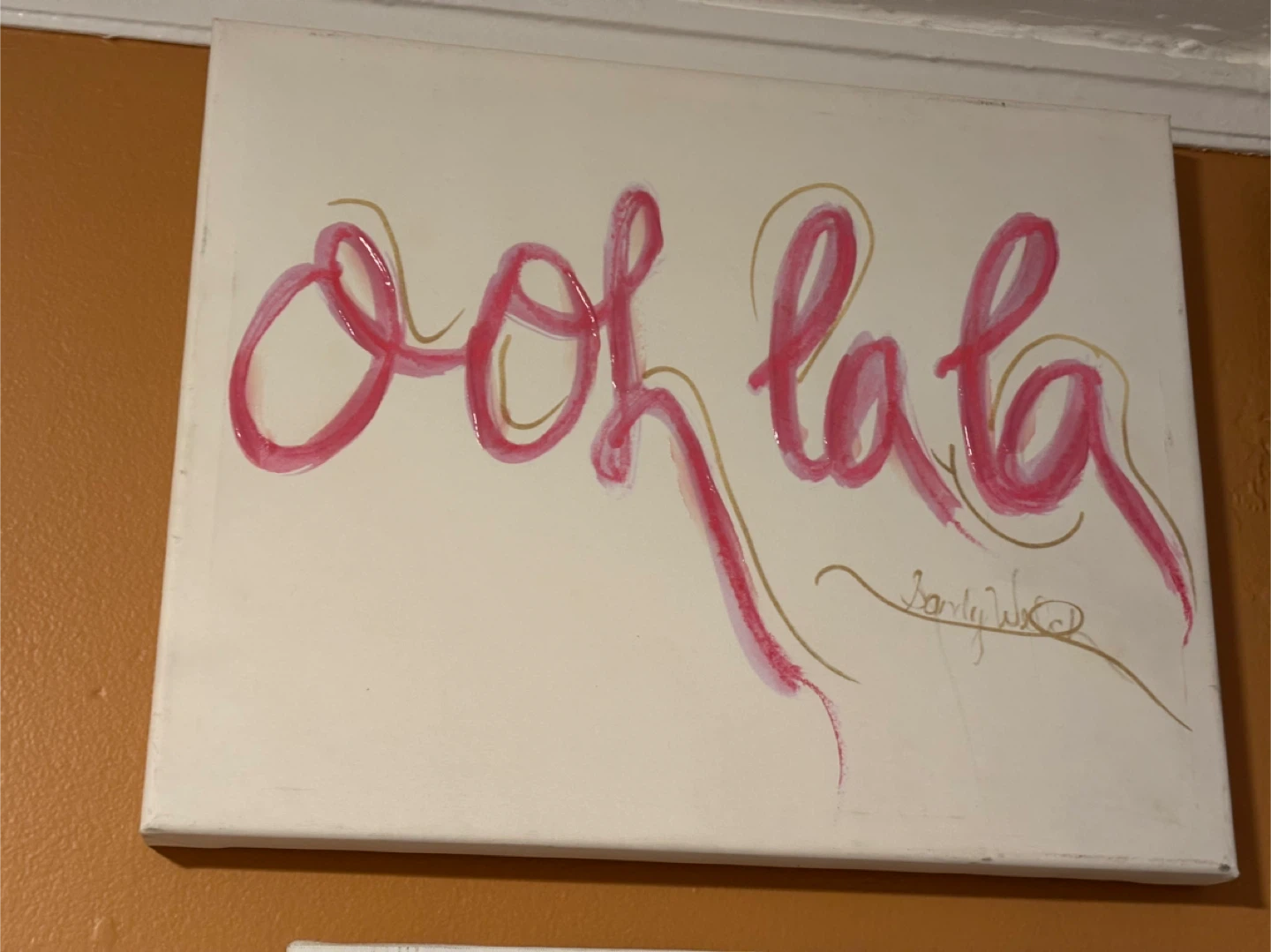 Selling a cute canvas art piece with the words "Ooh La La" painted on it in pink with gold accents. It's a fun and stylish piece to add to any room!