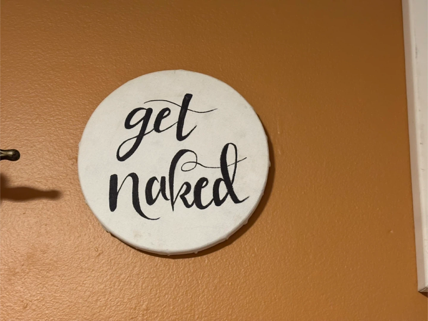 A fun piece of wall decor! This round sign features the words 'get naked' in a playful script. It's perfect for adding a touch of humor to your bathroom or bedroom
