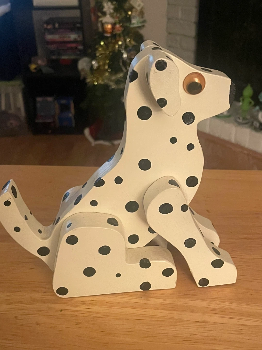 Here's a cute wooden Dalmatian dog figurine! It is white with black spots and has a whimsical design. It's a great piece for any dog lover or to add a touch of fun to your home decor