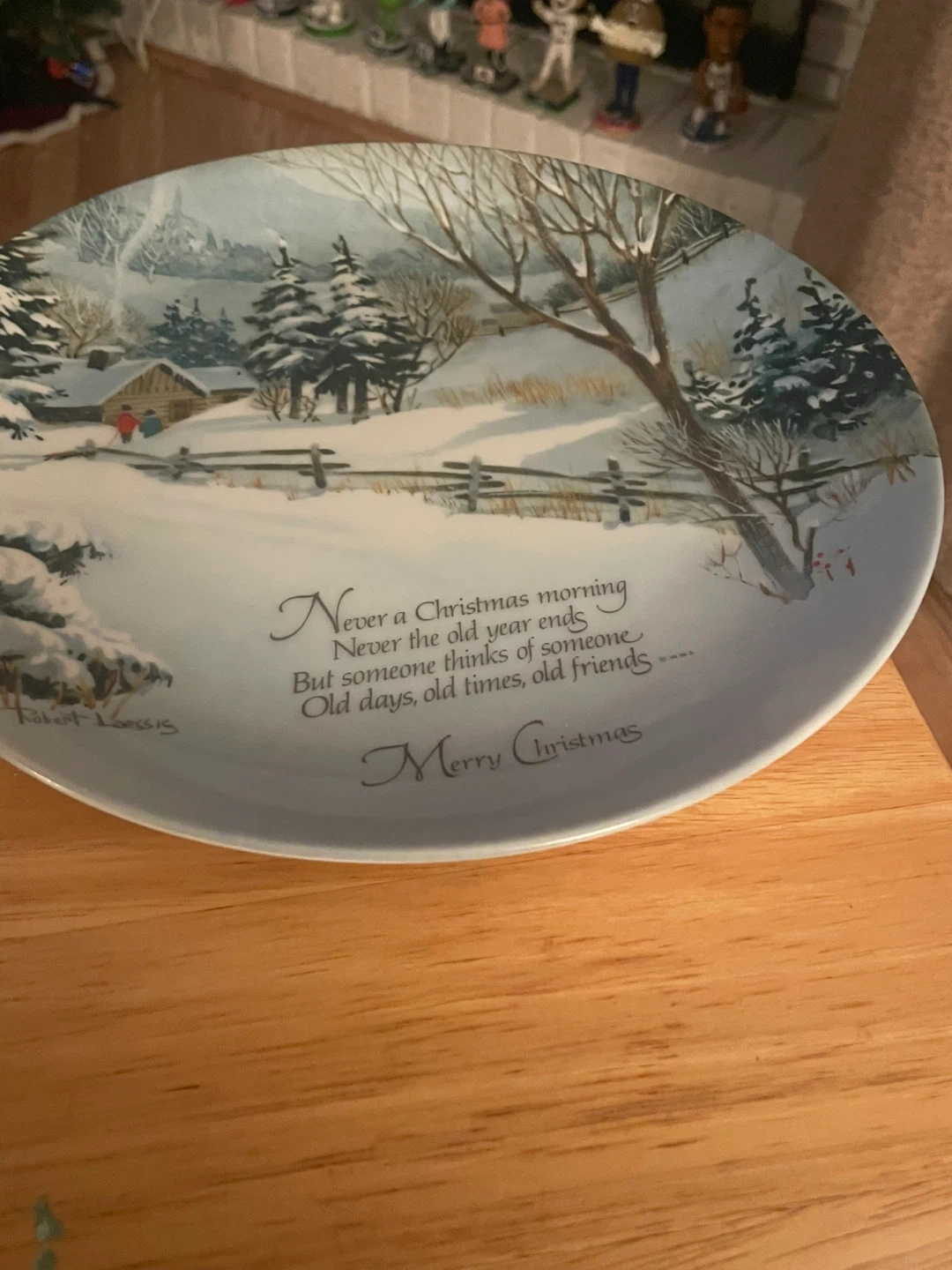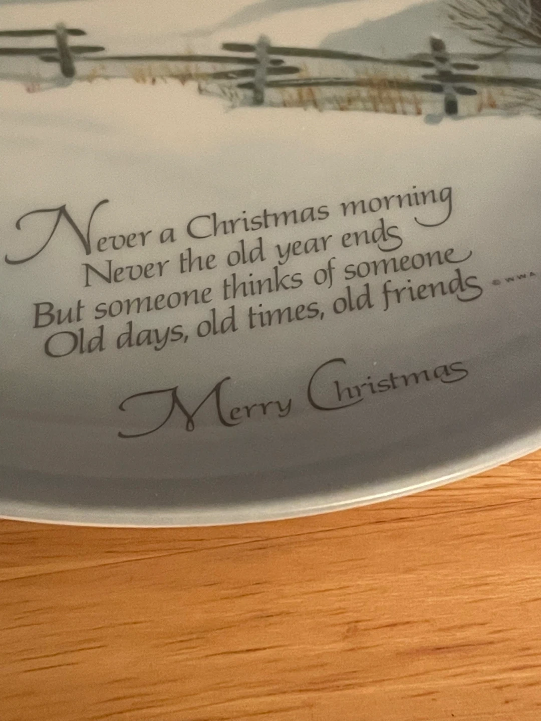 Vintage Robert Loessig Christmas plate. Features a winter scene with the words "Never a Christmas morning, Never the old year ends, But someone thinks of someone, Old days, old times, old friends... Merry Christmas"