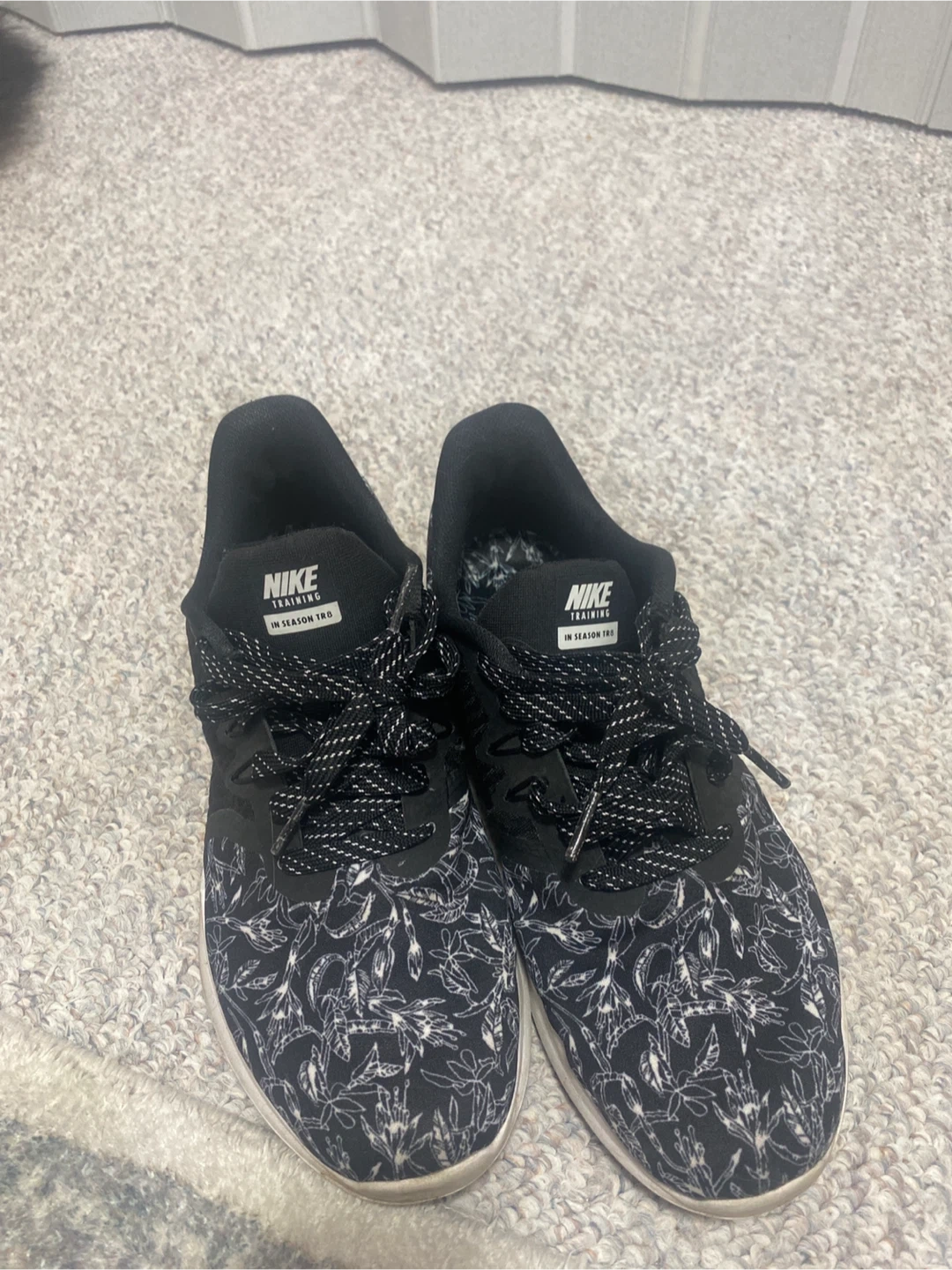 Selling a pair of Nike In Season TRD training shoes. They have a black and white floral pattern and are in good condition! Perfect for your next workout size 7.5 pick up cash only