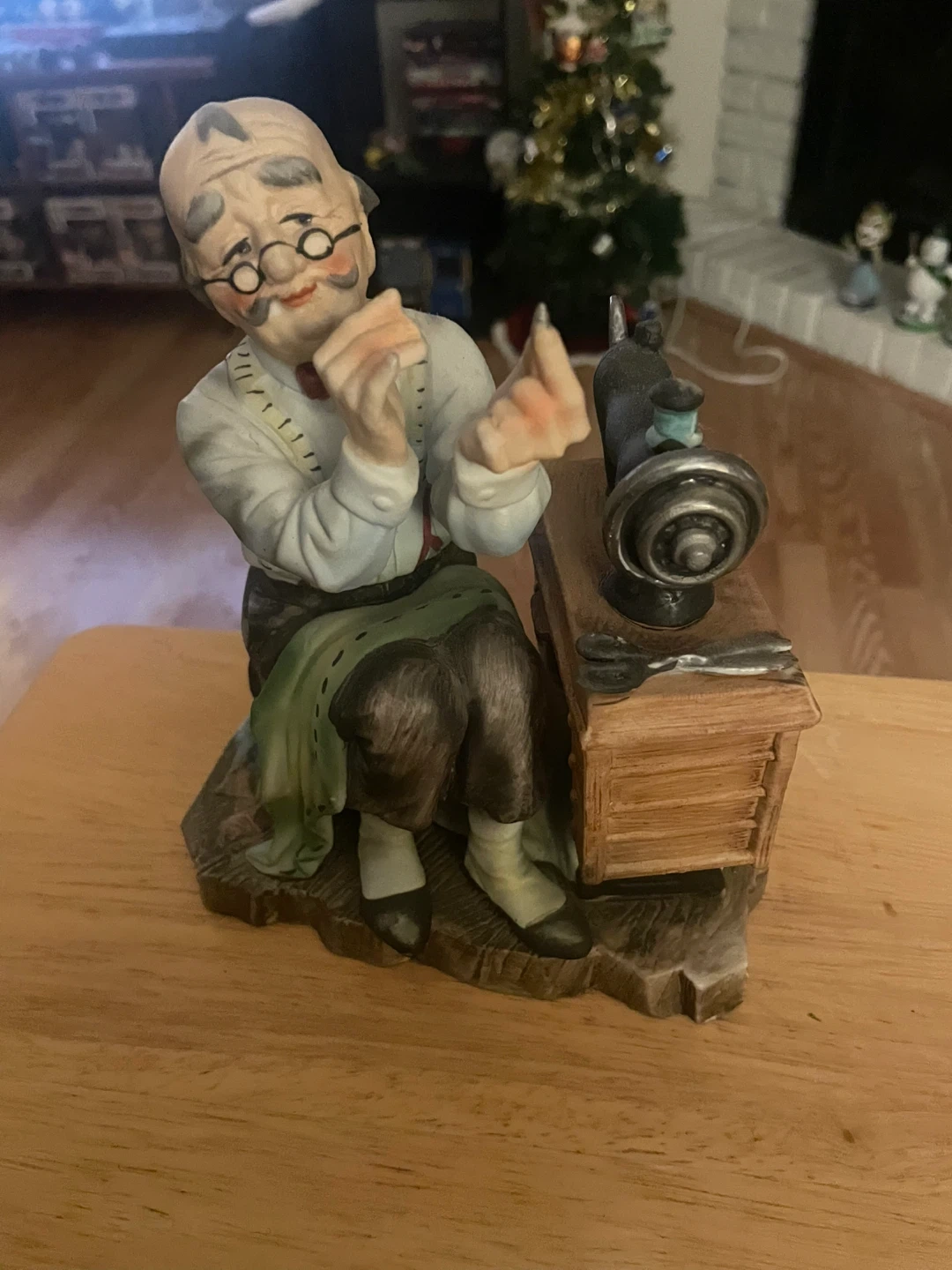 This is a vintage figurine of a tailor working at his sewing machine. It's a charming piece with lots of character and detail. Perfect for adding a touch of nostalgia to your home!