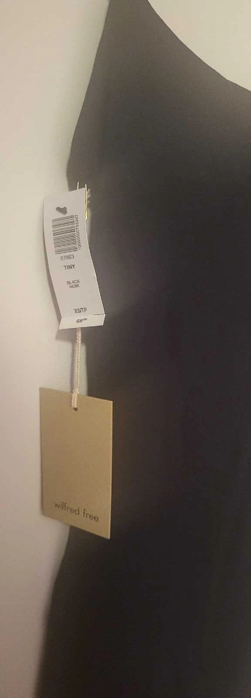 This Wilfred Free black short dress is a stylish and versatile piece, perfect for a night out or casual day. The dress is new with tags and has never been worn. Features: * Brand: Wilfred Free * Colour: Black * Style: Short dress with thin straps * Condition: New with tags This sleek dress is just waiting for its debut! And yes, if you're seeing this ad, the dress is still available, ready to make its way to your wardrobe.