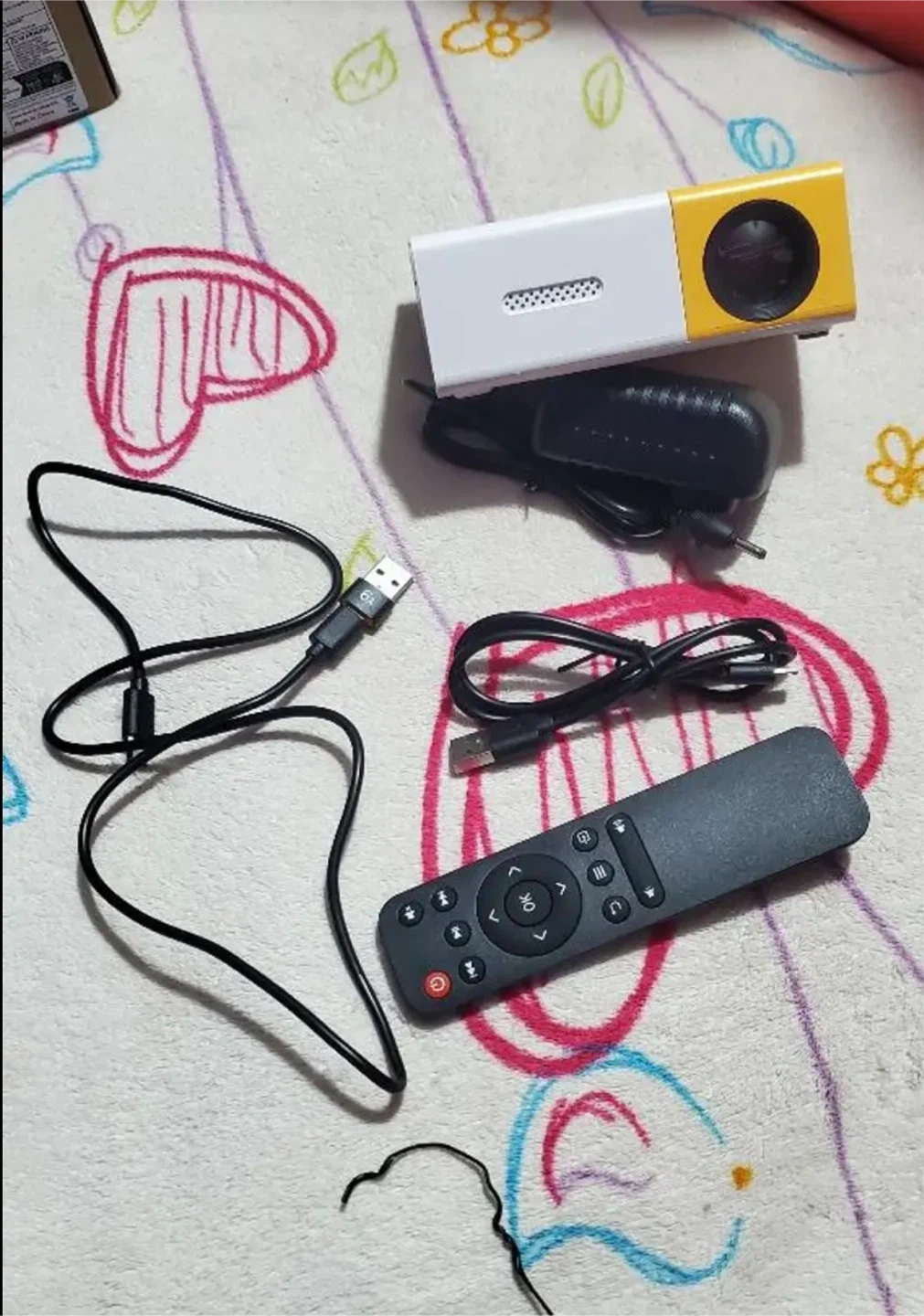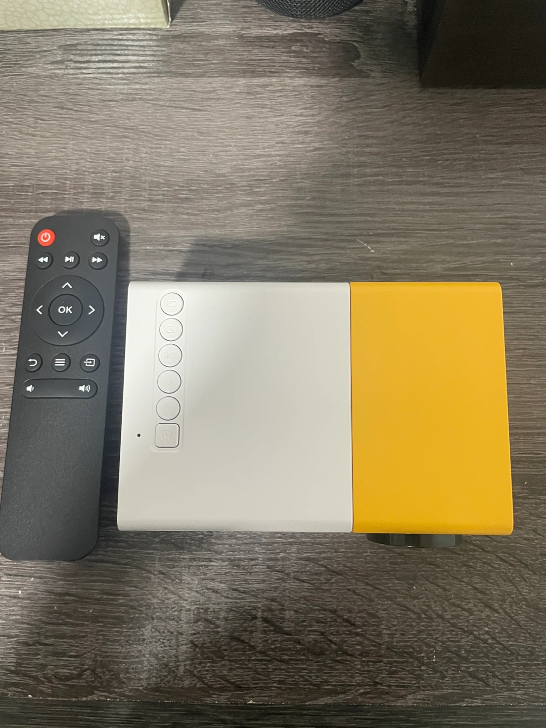 Selling a portable projector yellow and white colour! It comes with its remote and charger. It's super lightweight and portable, perfect for movie nights anywhere you go! And it has built in audio.