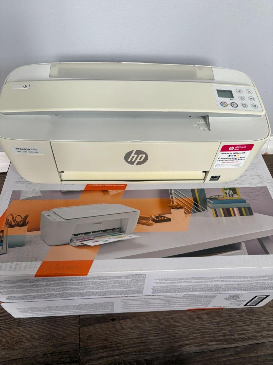 Selling a used HP DeskJet 3755 All-in-One Printer. It can print, scan, and copy. It is in good working condition and comes with the original box.