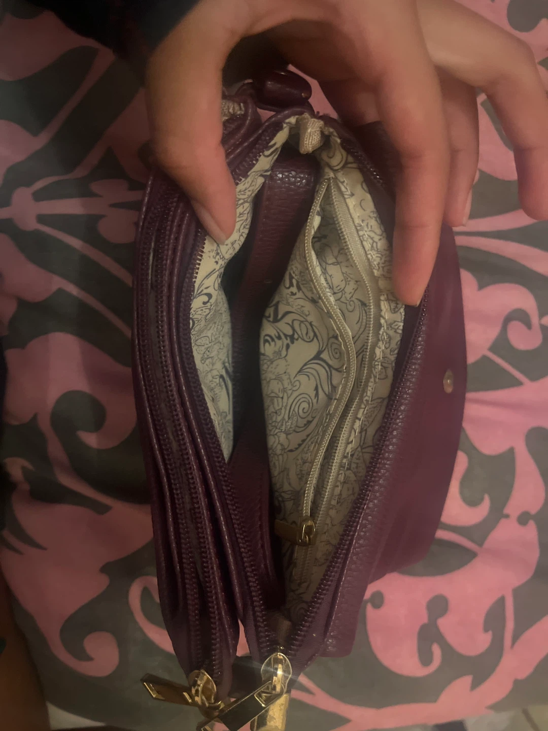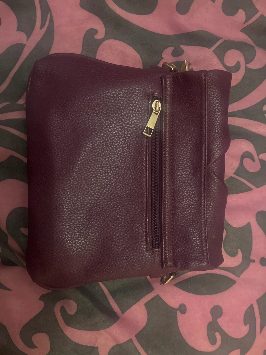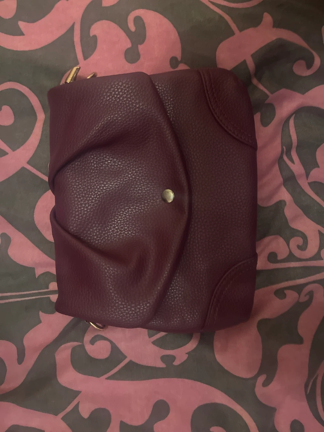 Selling a cute crossbody bag! It's a lovely burgundy colour, perfect for adding a pop of colour to any outfit. It features a zippered pocket and a snap closure. The interior has a nice pattern too!