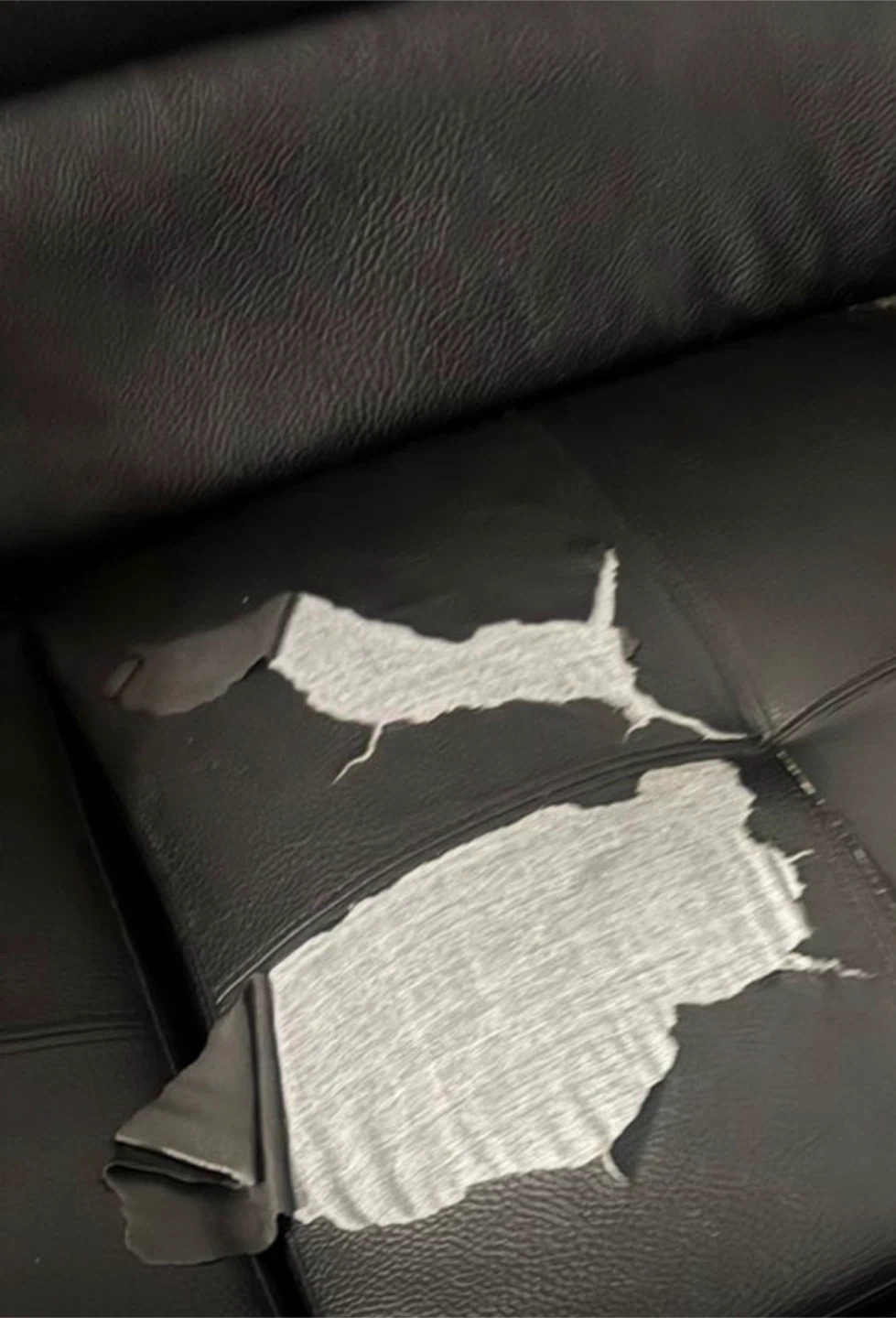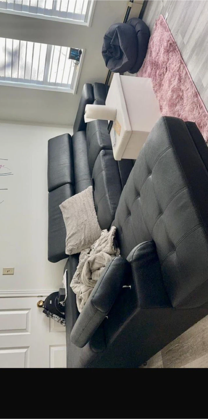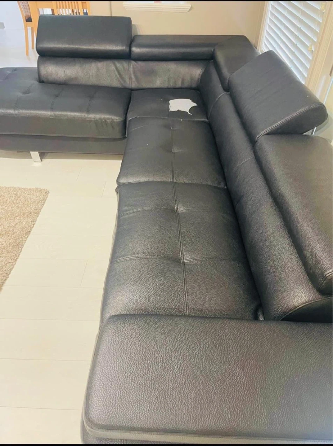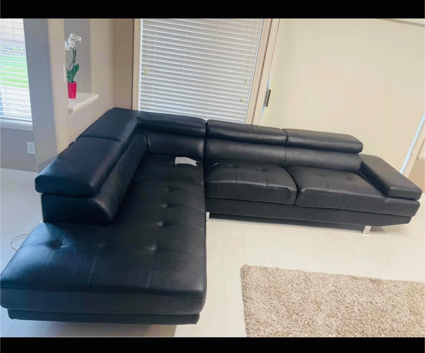 Selling a black leather sectional sofa. It has some wear and tear, as pictured, which can be fixed easily but is still comfortable and functional. Perfect for a living room or basement!