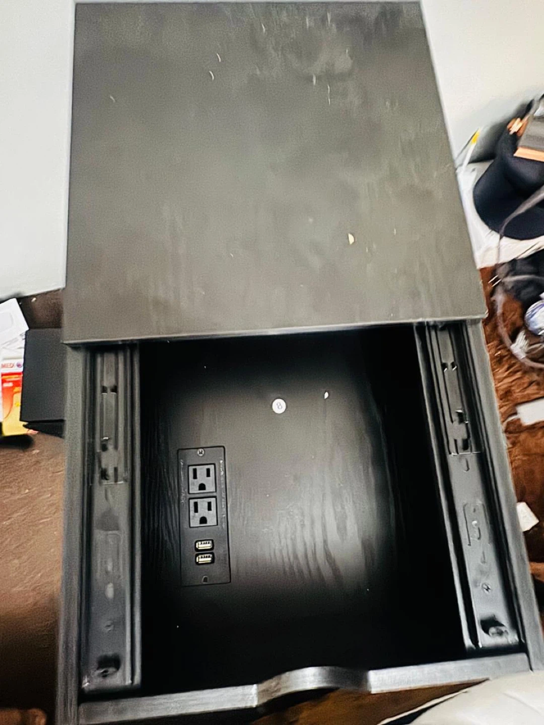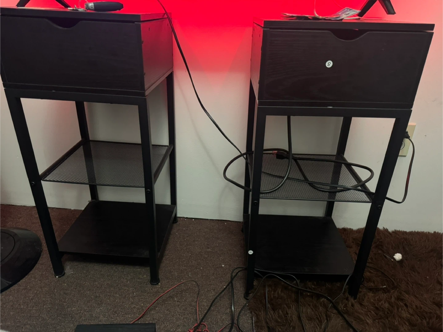 I'm selling a black wood nightstands. It features a drawer and a shelf for extra storage and it has socket inside both .It's in great condition and would be perfect for any bedroom!