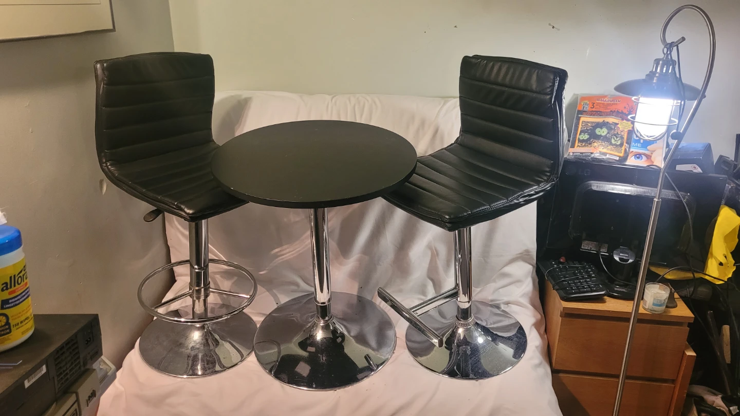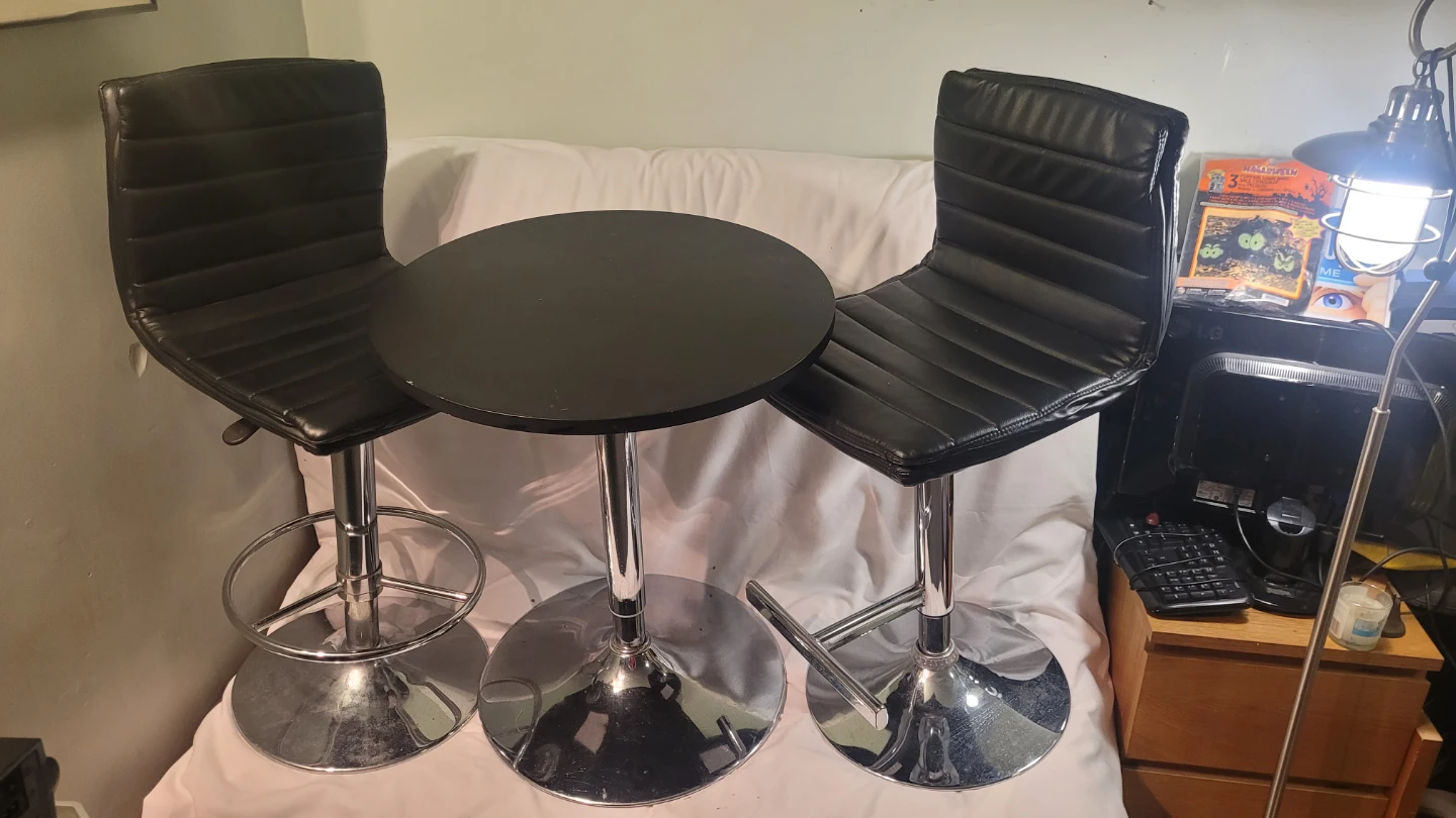 Selling a bar table with two stools. The set is black with chrome bases. Perfect for a small space!