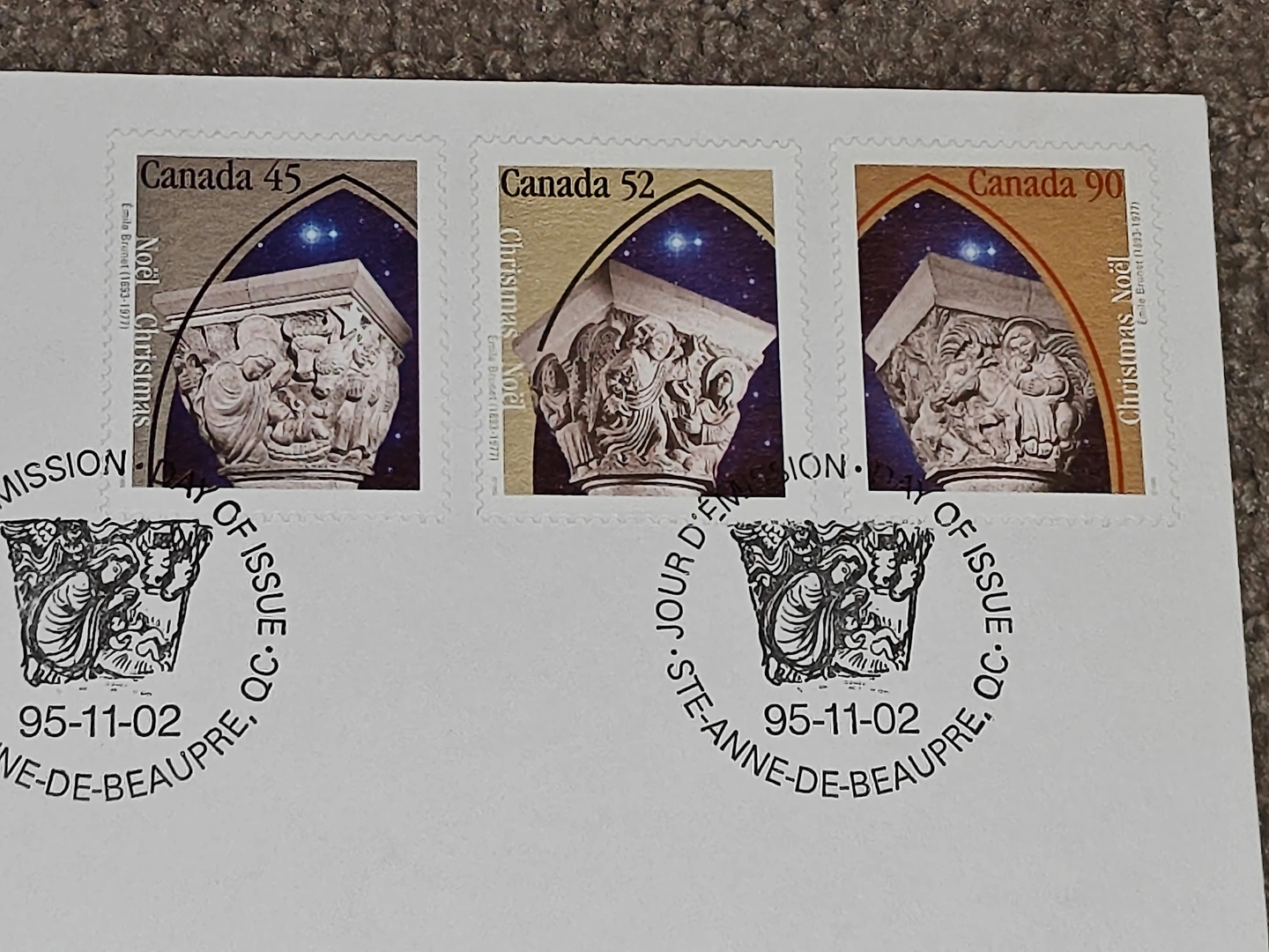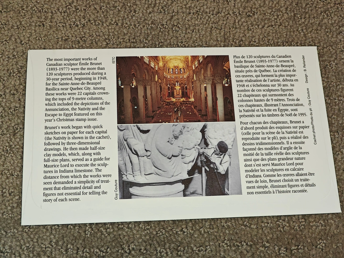 Historical Context: The stamps depict intricate details from the 22 capitals atop the 9-meter columns within the Sainte-Anne-de-Beaupré Basilica near Quebec City. These sculptures were created by Émile Brunet (1893-1977) over a 30-year period beginning in 1948. The specific scenes featured on the stamps are: