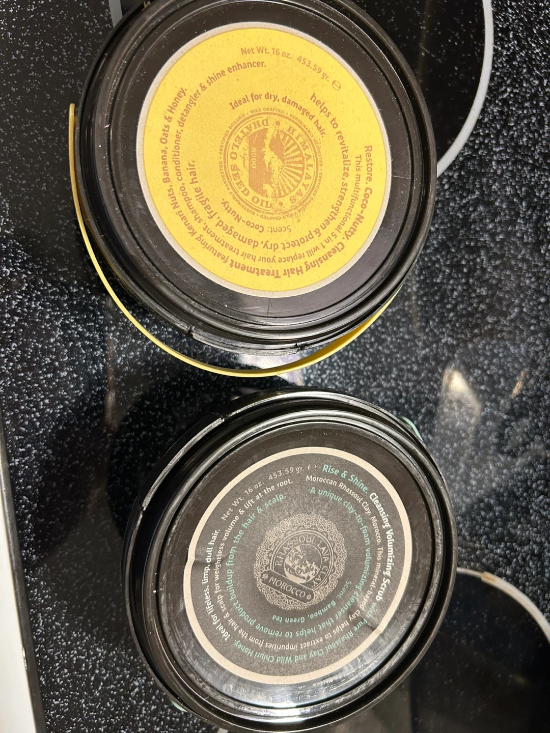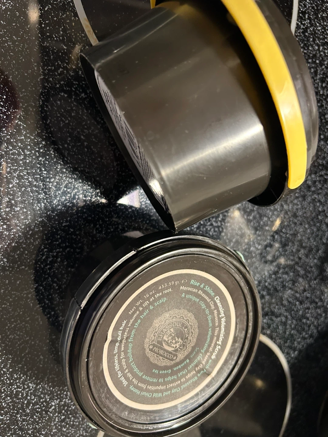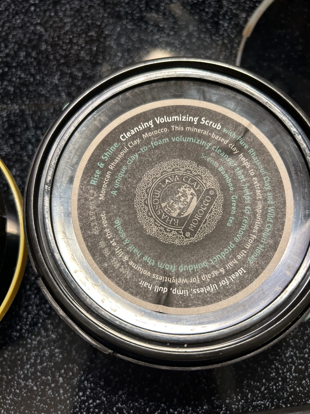 - Rise & Shine Cleansing Volumizing Scrub with Pure Rhassoul Clay, Moroccan Rhassoul Clay, Moroccan, Scent is Bamboo, Green Tea