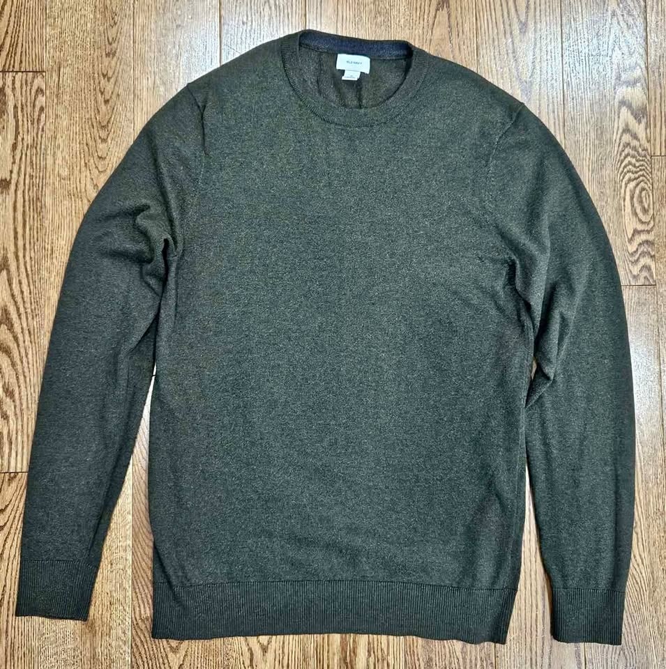 This is an Old Navy crew-neck sweater in size medium with a stylish olive green colour, perfect for adding a touch of warmth to any outfit; it's made of a soft, comfortable knit. It's in good used condition.