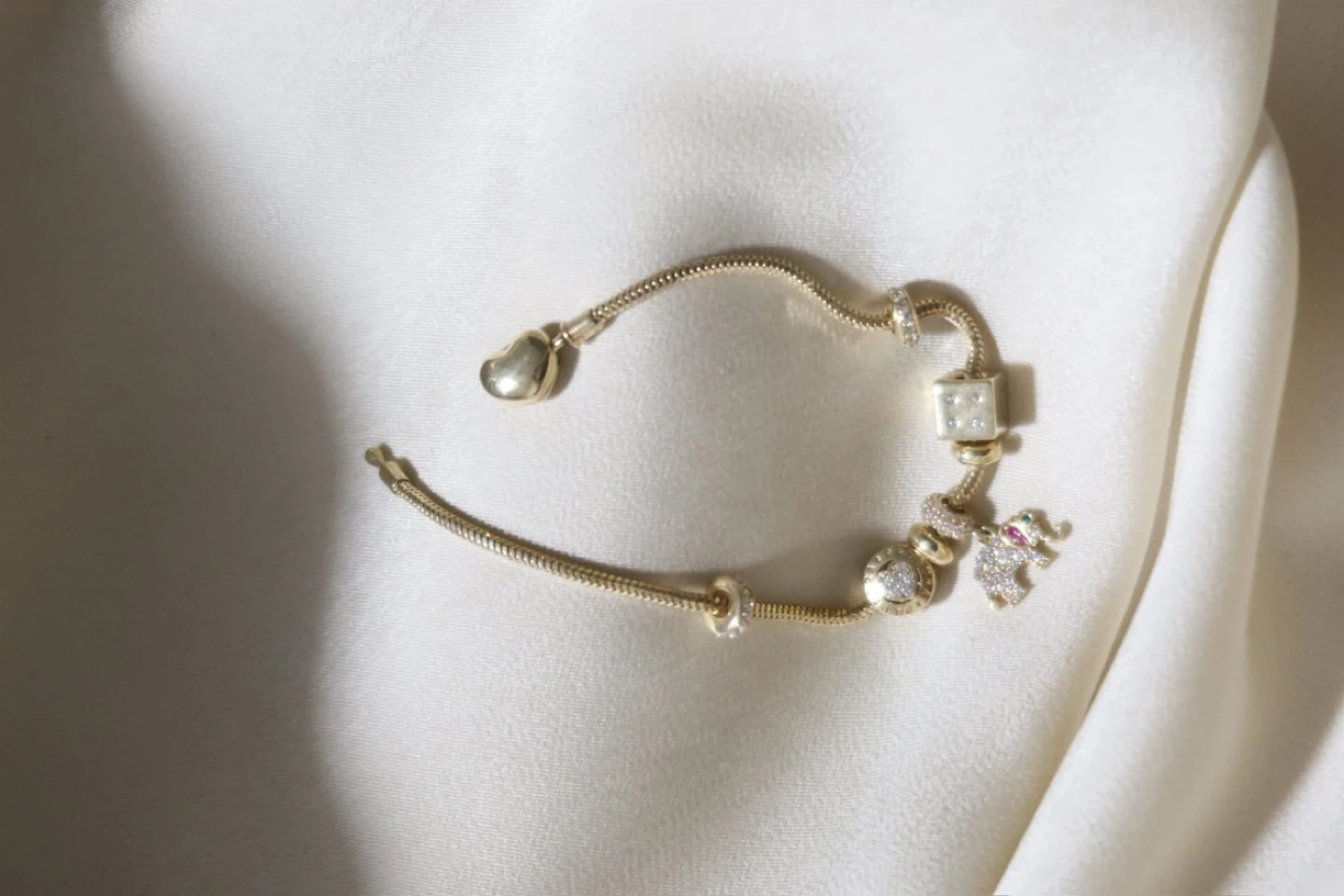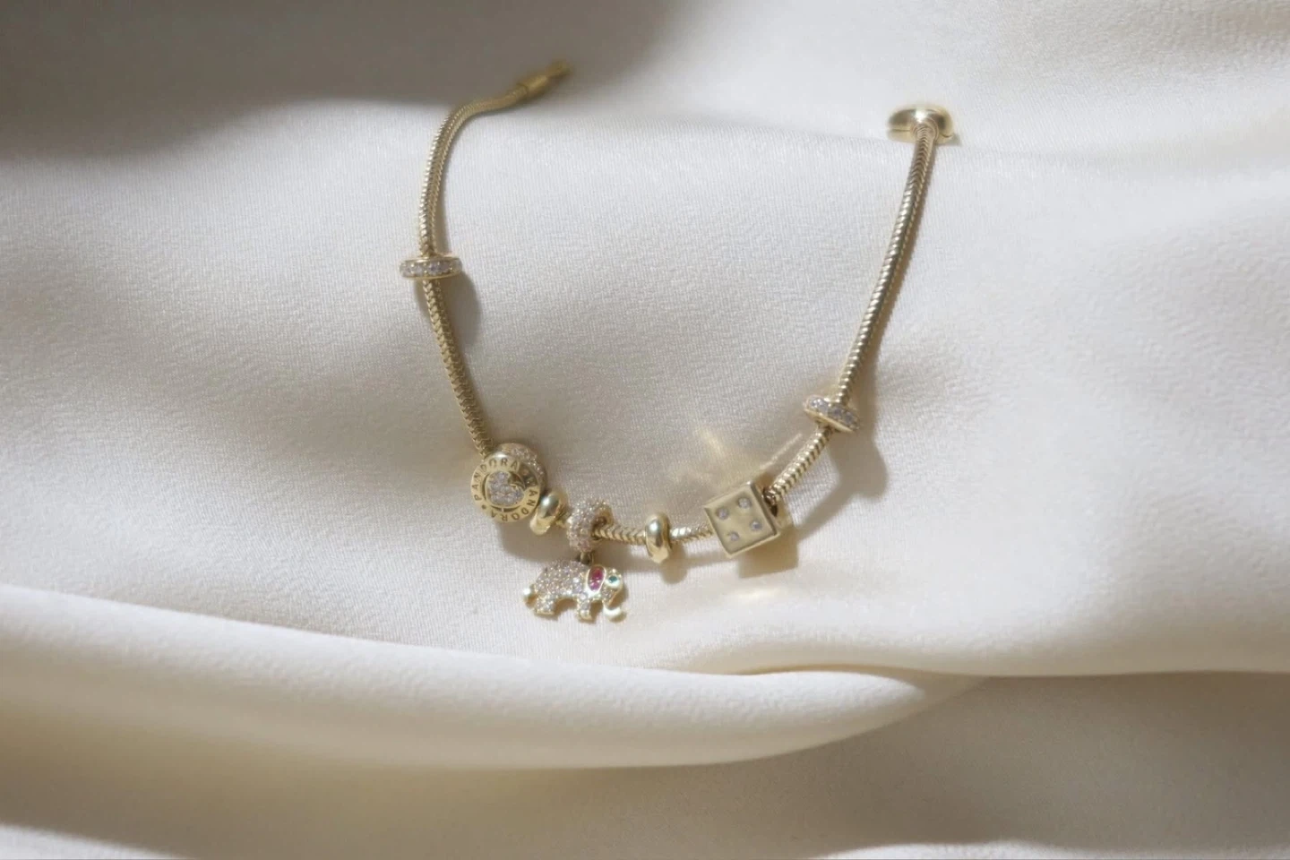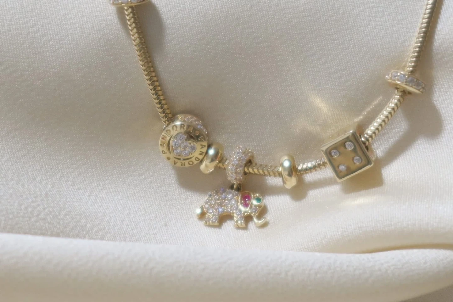 Selling a beautiful Pandora charm bracelet in 14k gold. It features a variety of charms including an elephant, heart, and dice. Perfect for adding a touch of sparkle to your style! 14k gold.