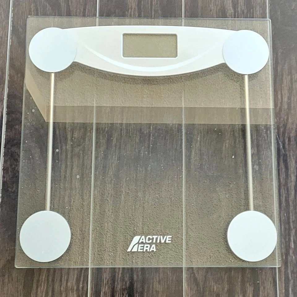 Modern Active Era Digital Bathroom Scale in excellent working condition. Features a clear tempered glass platform and precise digital sensors for accurate weight readings.