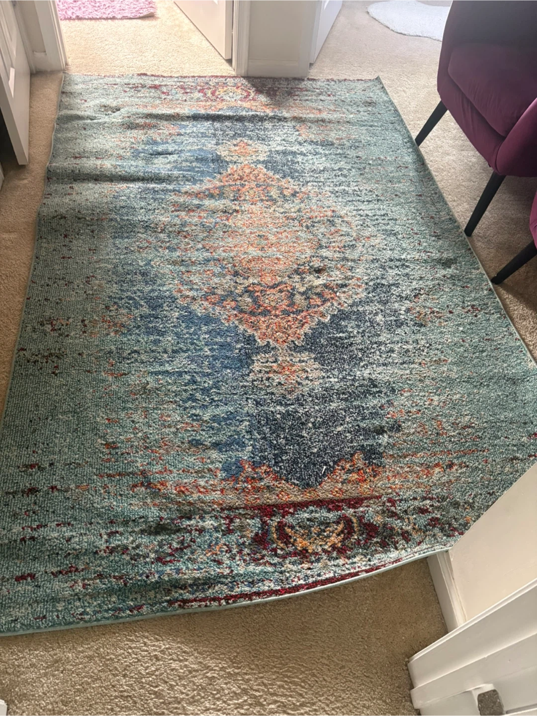 This is a nice area rug in multicolor. It's in good condition and ready for a new home! It would look great in any room of your house