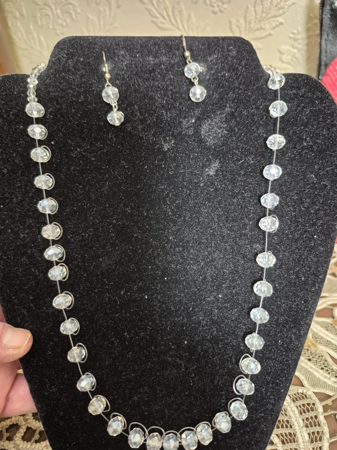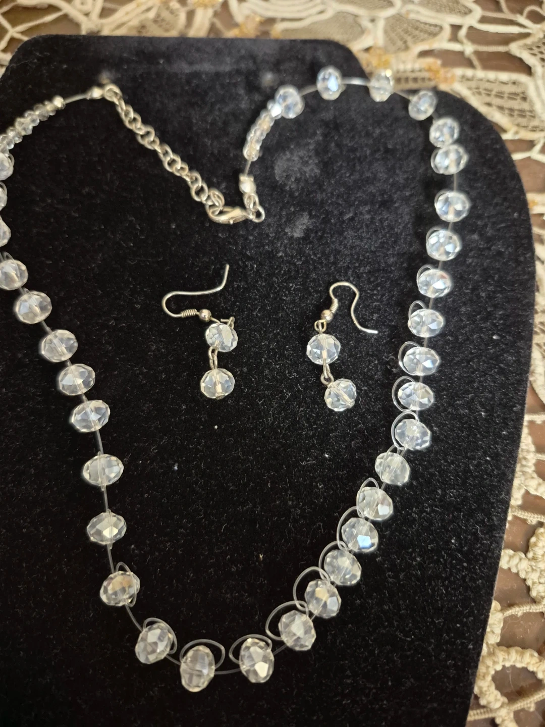 Selling a handcrafted lovely crystal bead necklace with matching earrings. This set is perfect for adding a touch of sparkle to any outfit. The necklace is a comfortable length and the earrings are lightweight. Great for special occasions or everyday wear!
