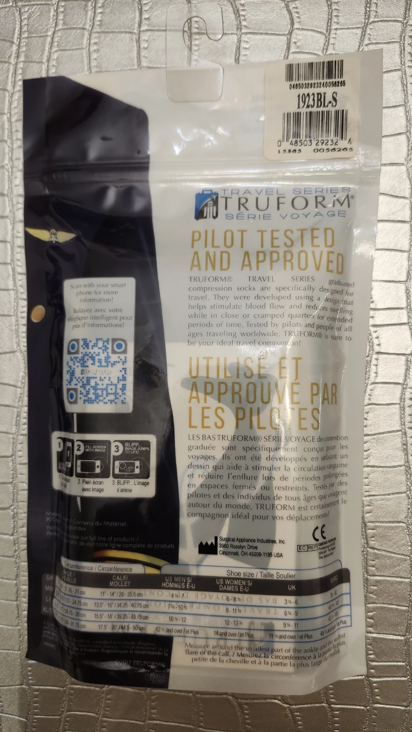 These Truform Travel Series compression socks are designed to help reduce swelling and soothe tired legs, especially during travel. They are black and size small. Originally bought for $17.99