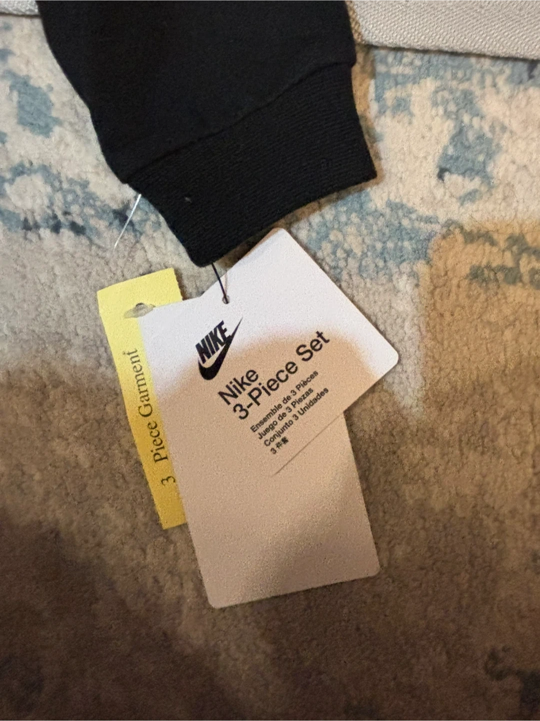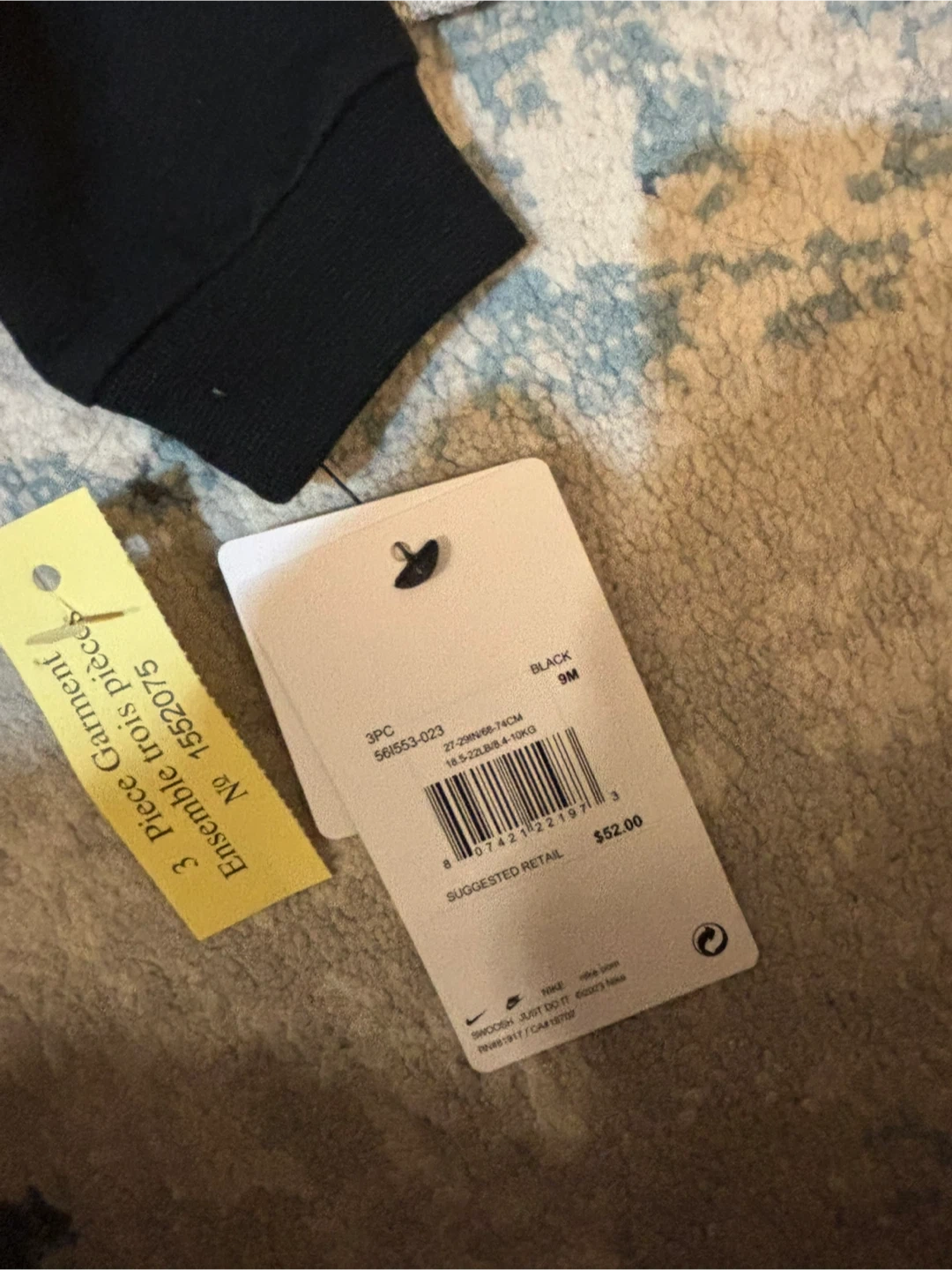This is a brand new Nike 3-piece garment set in black, size 9M. It includes a jacket, pants, and bodysuit. The suggested retail price was $52.00