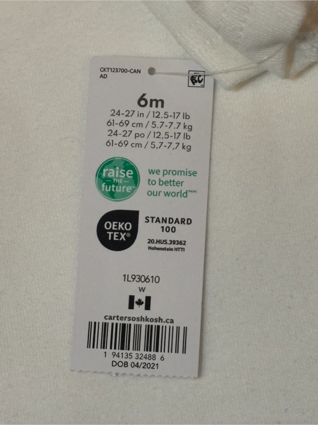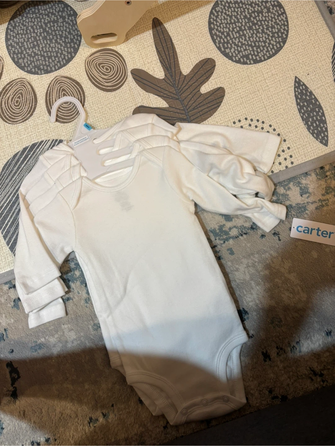Selling a set of Carter's white long-sleeve onesies, size 6 months! These are in great condition and perfect for layering or wearing on their own. Recommended for babies 24-27 inches tall and 12.5-17 lbs. DOB 04/2021