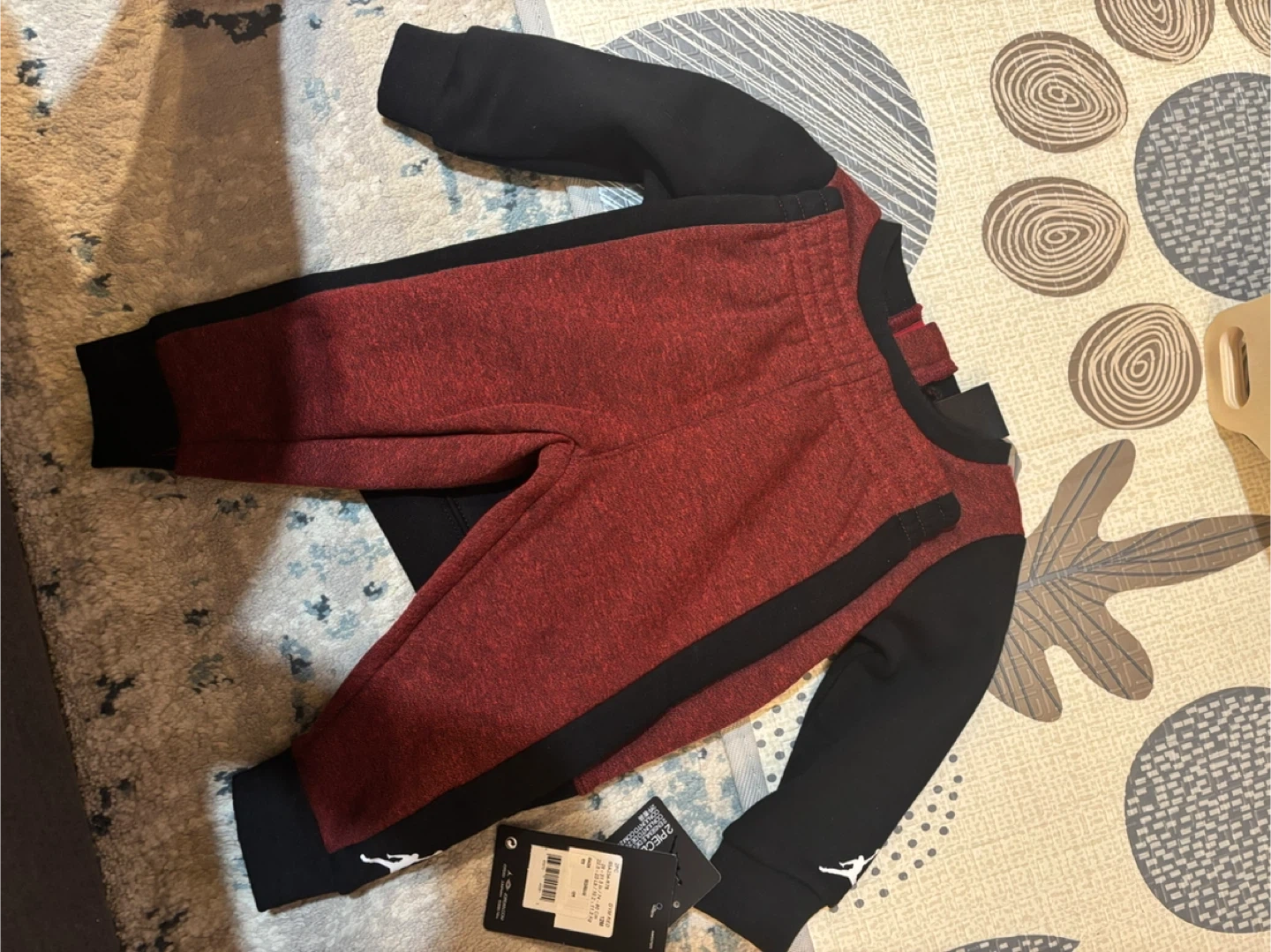 Selling a Jordan 2-piece set in size 12M! The set includes a sweatshirt and pants, perfect for your little one. The sweatshirt features the Jordan logo prominently displayed. The set is in excellent condition and ready for a new home!
