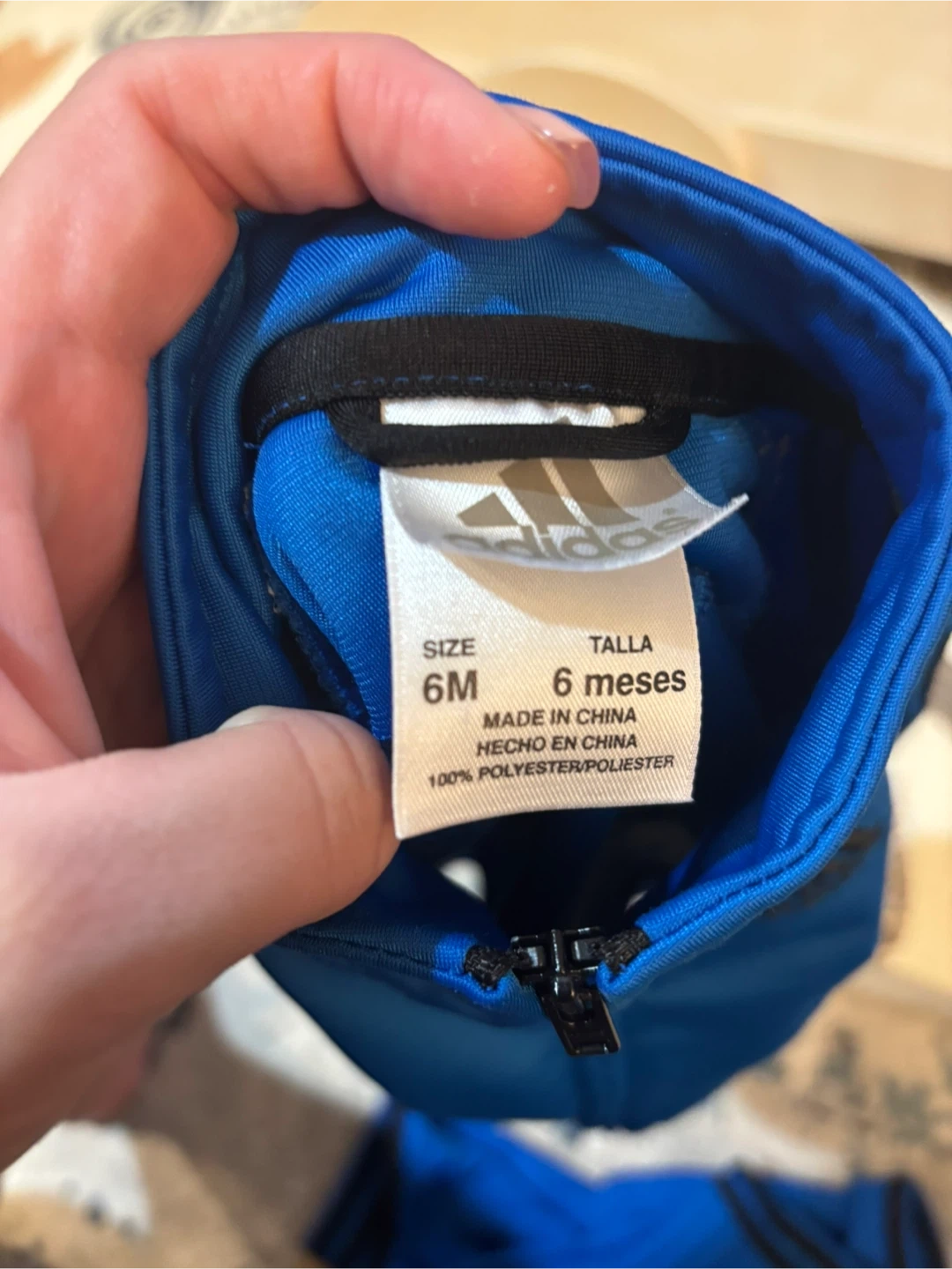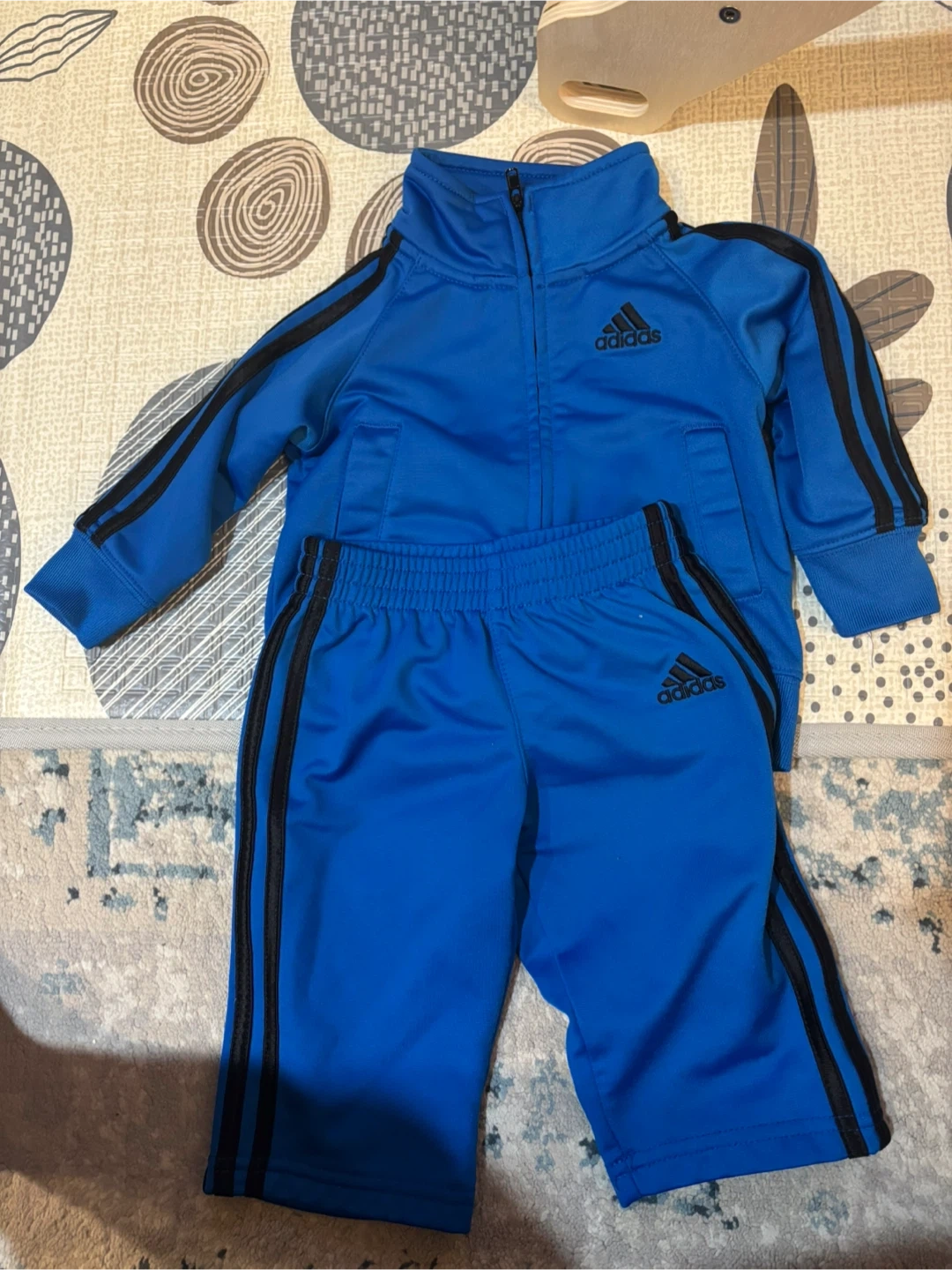 Cute blue Adidas tracksuit for your little one! It's in great condition and perfect for keeping them comfy and stylish. Size is 6M