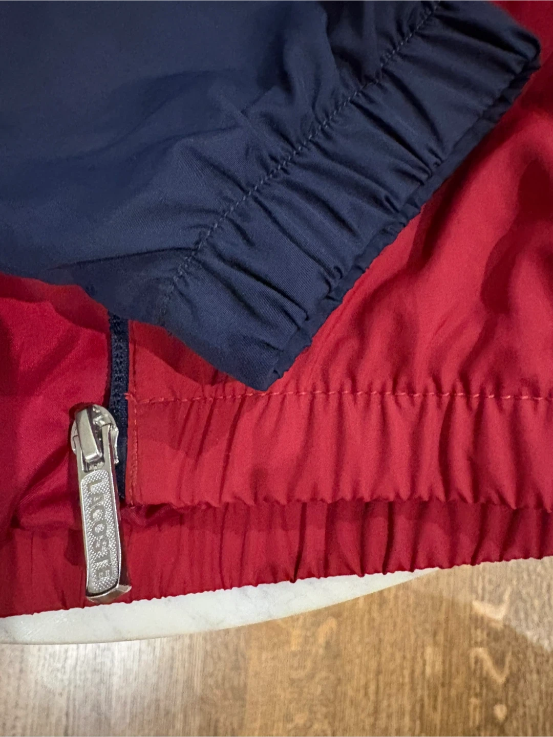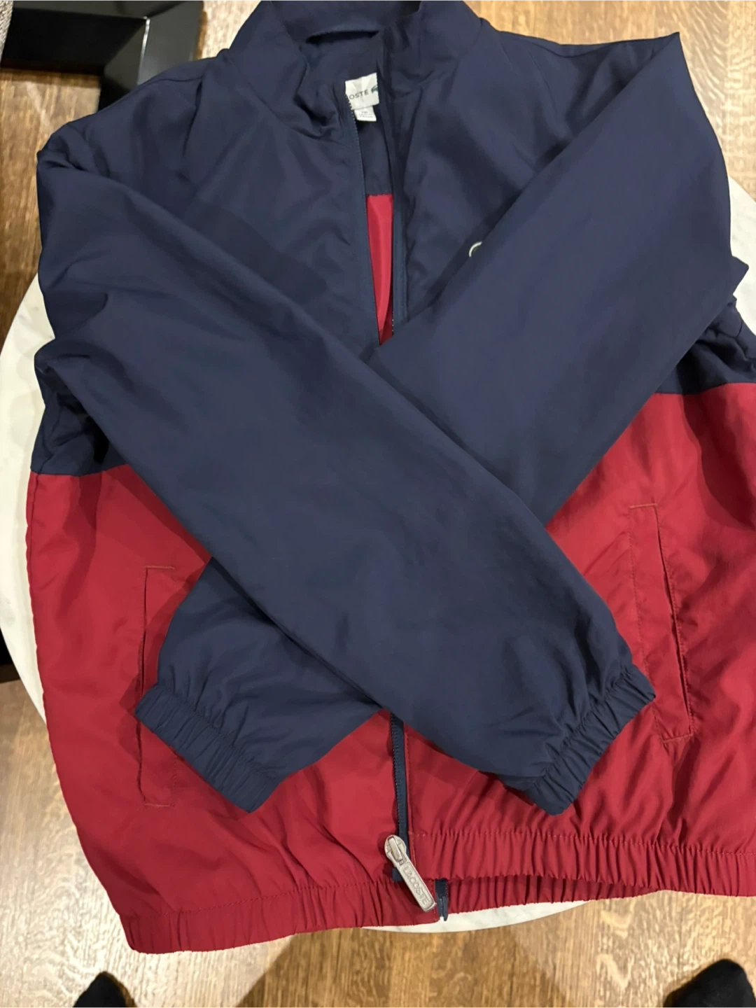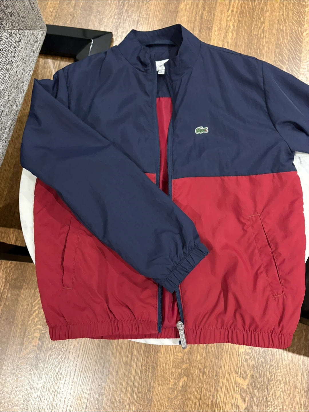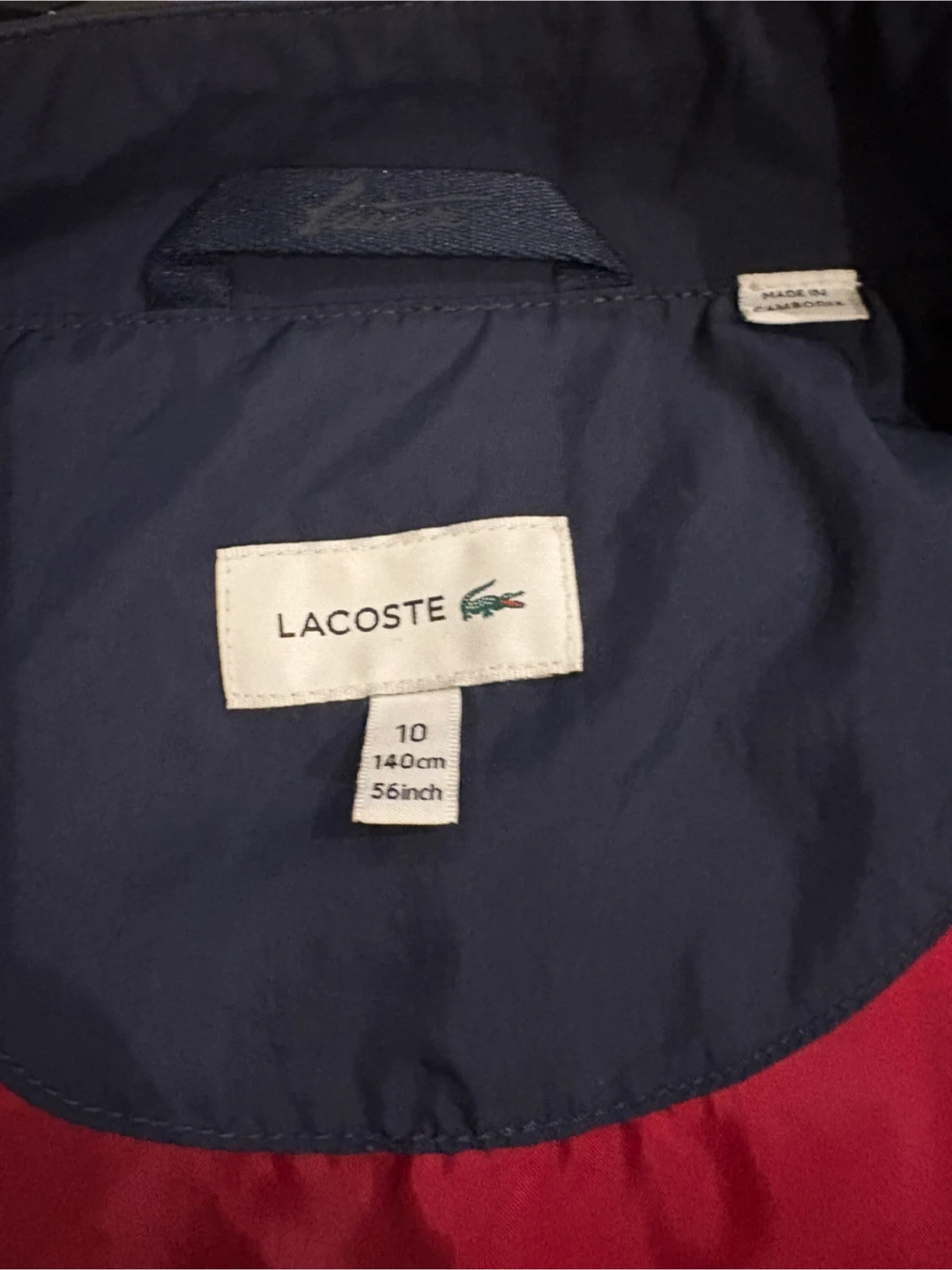 Never worn. This authentic Lacoste color-block windbreaker (navy & red) is in fantastic condition — no rips, stains, or fading. Features the iconic crocodile logo, full zip, and comfy elastic cuffs. First well age 8-10